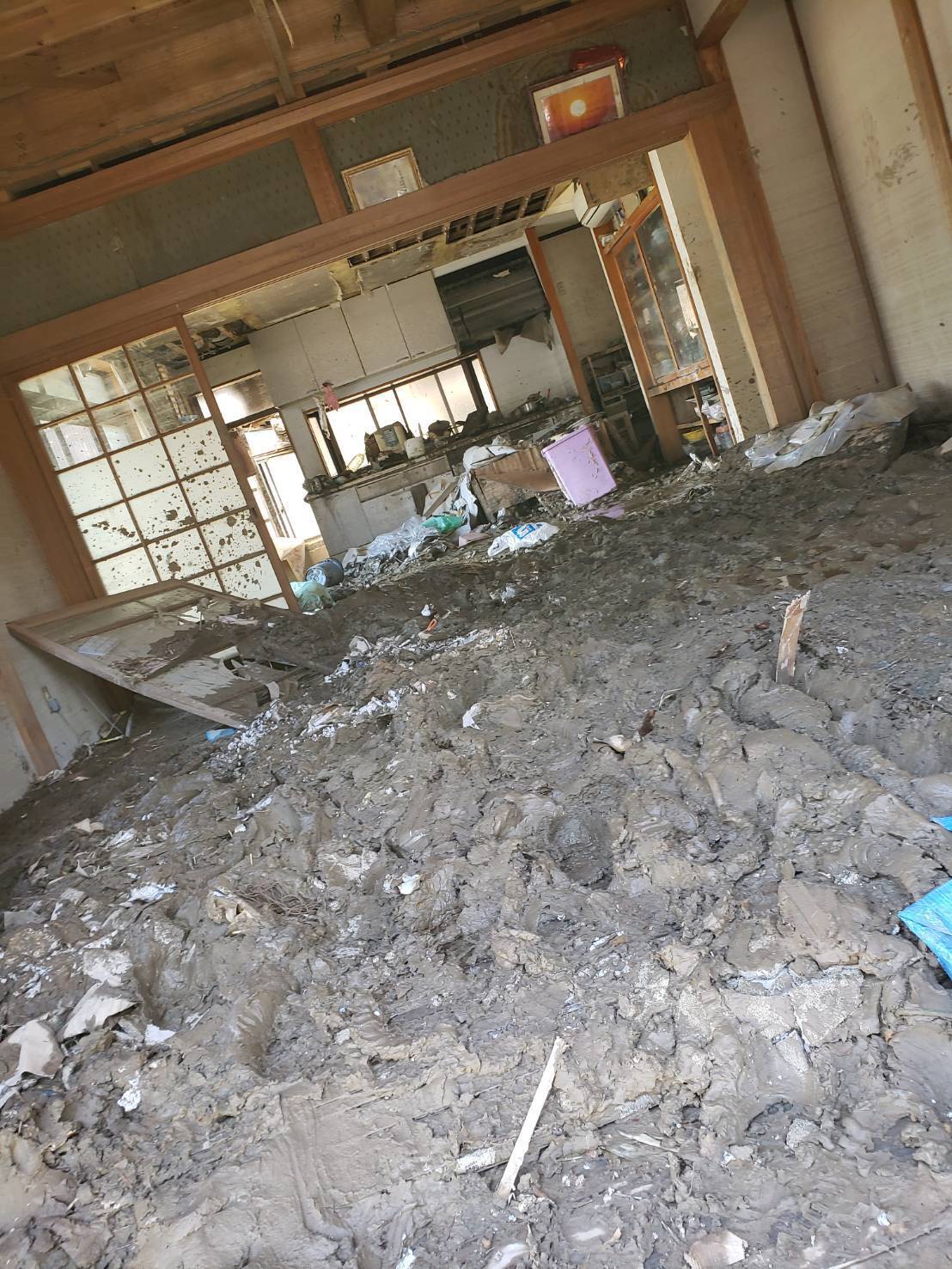 住宅の2階まで浸水し、泥出しをして再建に向けて復興作業。