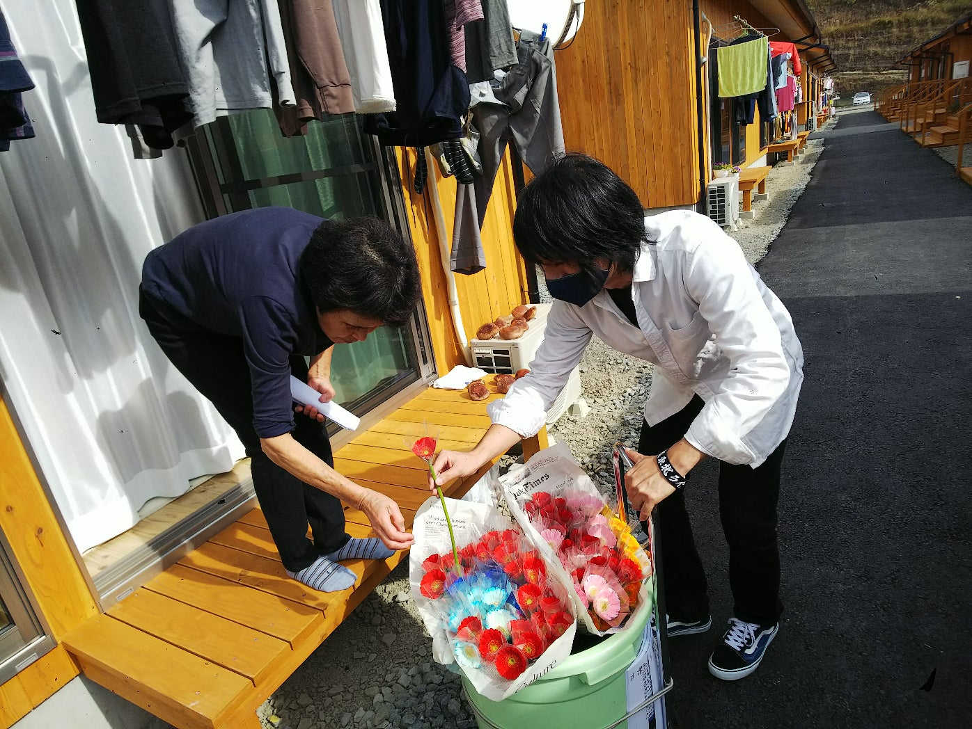 仮設住宅にお花を届けながら一軒ずつ会話をし心の支援という形で被災地と日々向き合い前進していこうとする中で私達が出来る事をやっていきたい!っと言う皆んなの共通意思のもと地域の復興作業へ活動を広げていきました。