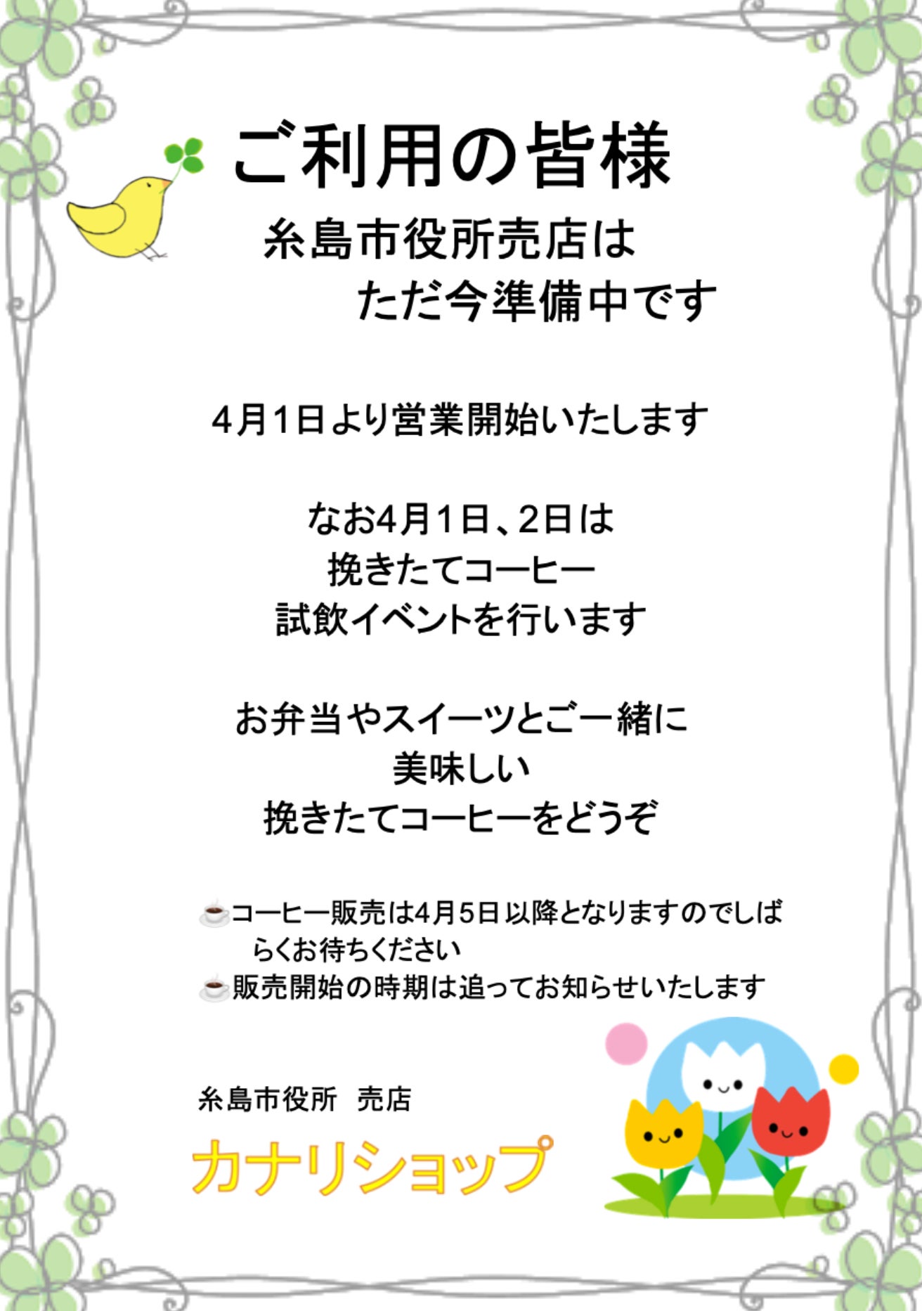糸島市役所内の売店は、ちっちゃいけど可愛いショップに生まれ変わります。現在はコーヒーの販売が停止されていますが、お仕事の合間に、手続きの待ち時間に、お待ち合わせに!美味しいコーヒーが飲める施設に変身させます。