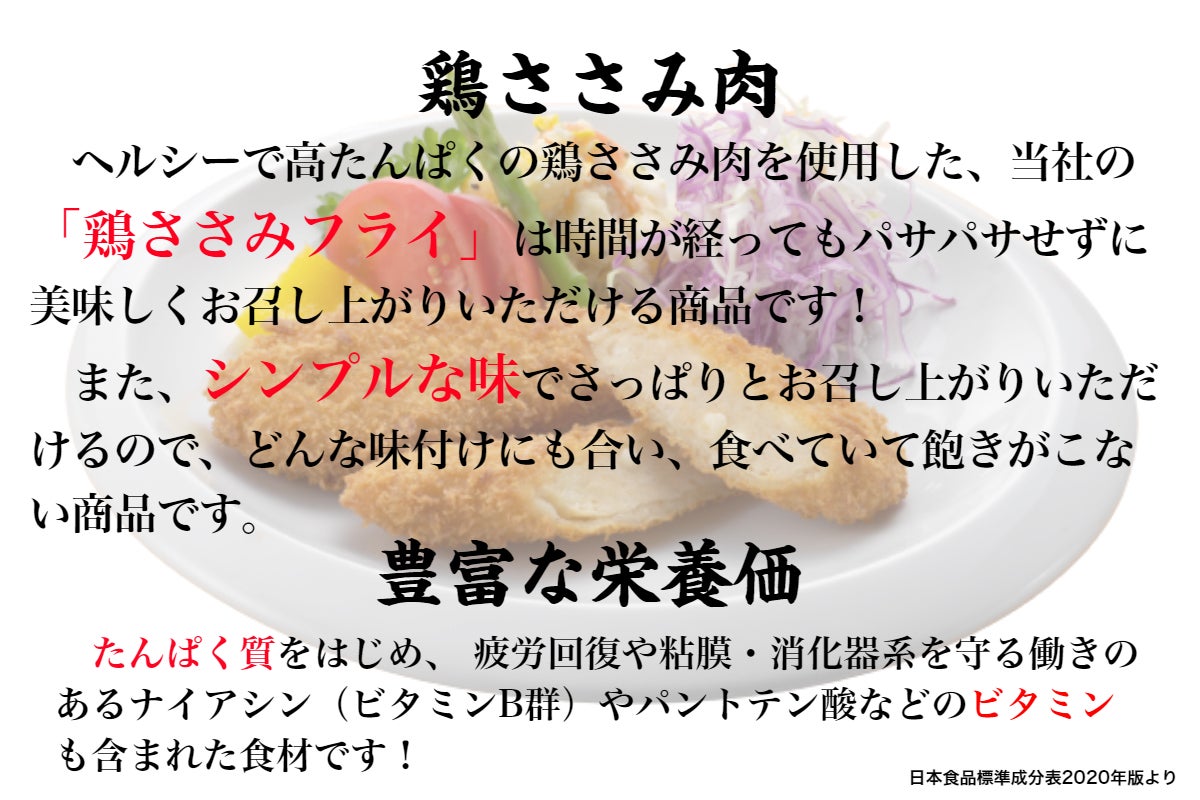 そんな鶏ささみ肉はややパサつくことから、好き嫌いが分かれますが、当社のささみフライやささみ天は、加熱してもしっとり柔らかでパサつかないようにひと手間をかけた加工を行っています!
