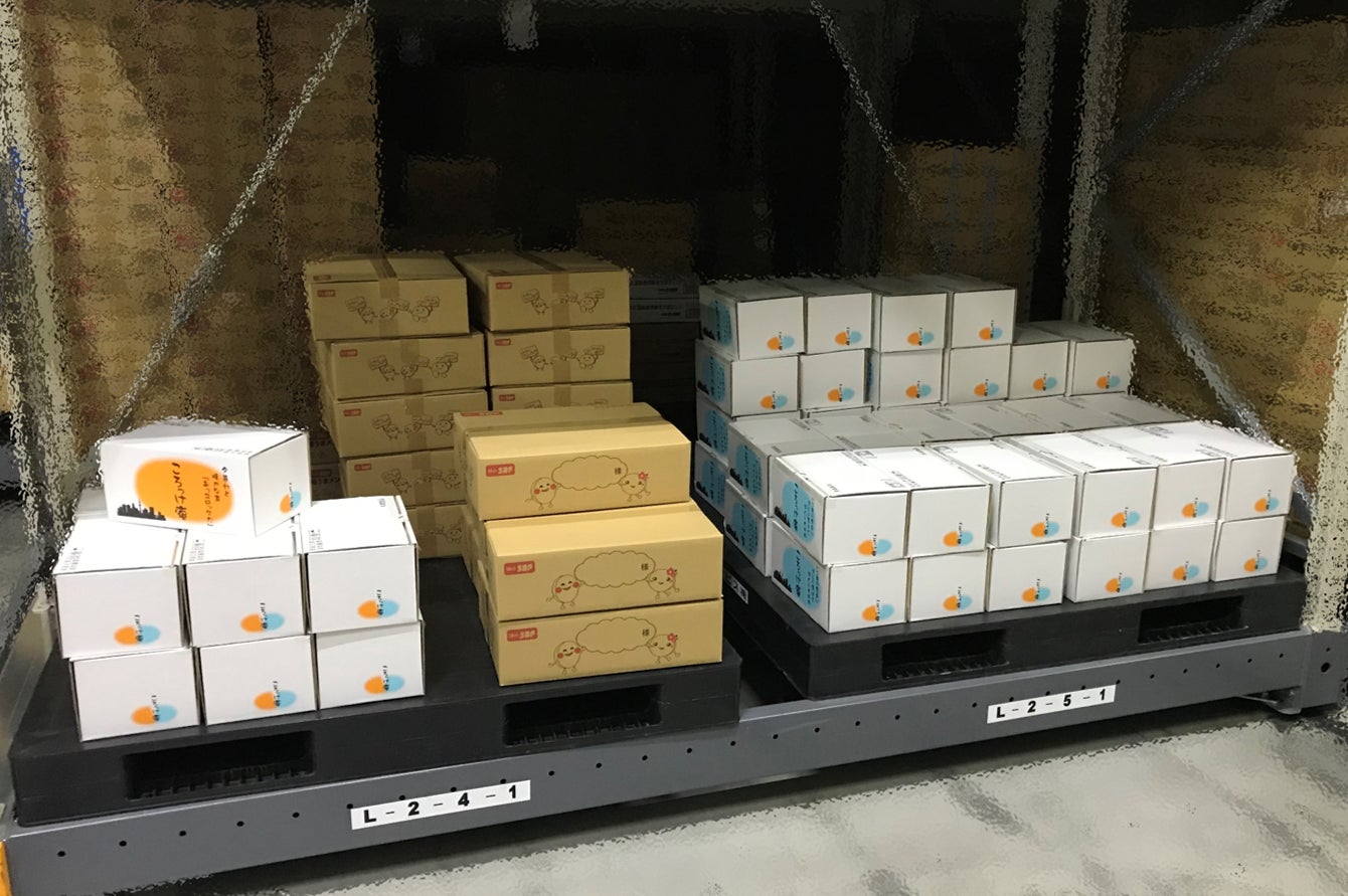 入れ間違わないように気をつけながら、感謝の気持ちを込めて箱詰めし、弊社の冷凍倉庫(高速道路から見えるコロ作とメン花ちゃんが描いてある建物です!)にて保管中です!