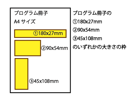 ・全国学生邦楽フェスティバル冊子の紙面の自由枠( ①横180x縦27mm、②横90x縦54mm、③横45x縦108mmのいずれか一つ)