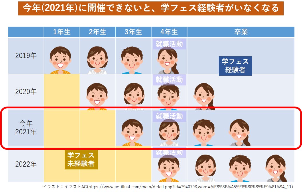 コロナ禍の影響で、昨年は開催を見送っています。今年開催できなければ、学フェスを経験した大学生がいなくなるため、今年の開催は必須です。