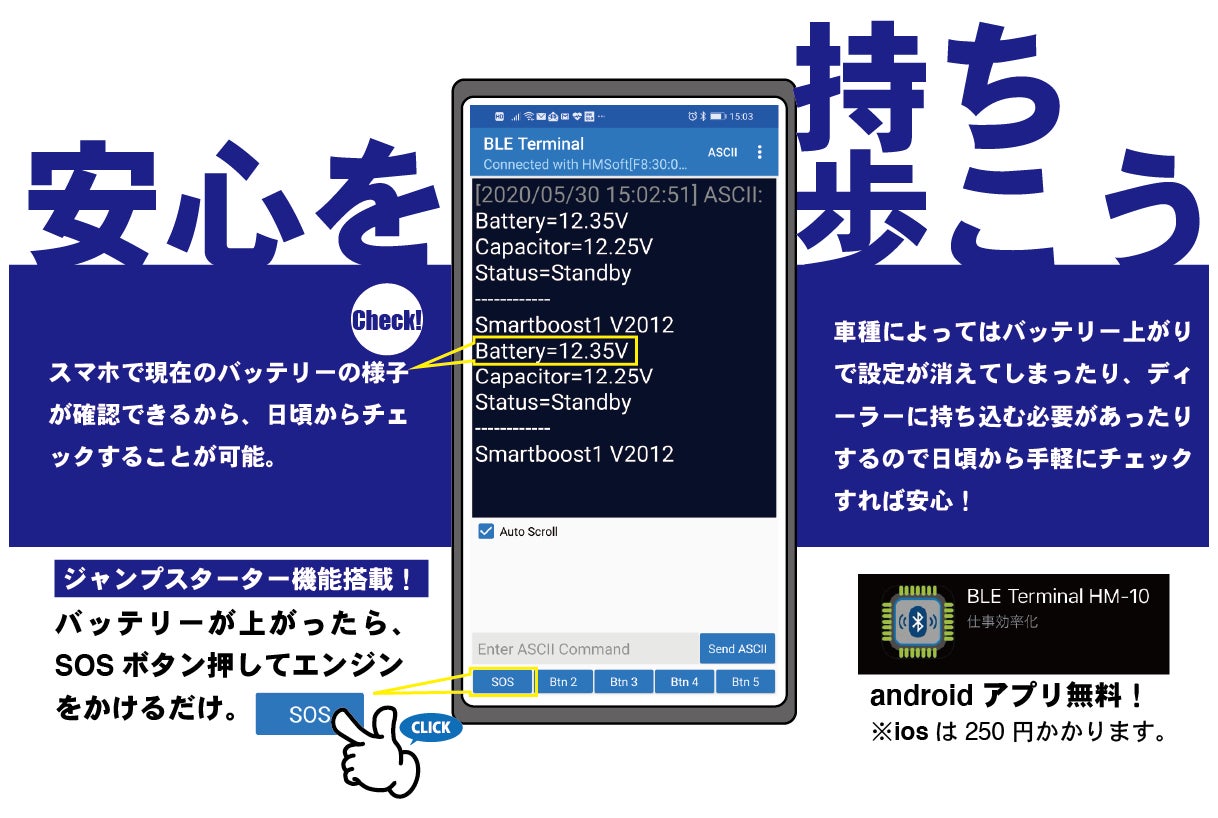 ・バッテリー状況をスマホで管理し、バッテリー上がり時はスマホ操作でセル回転の電圧を生成できます。