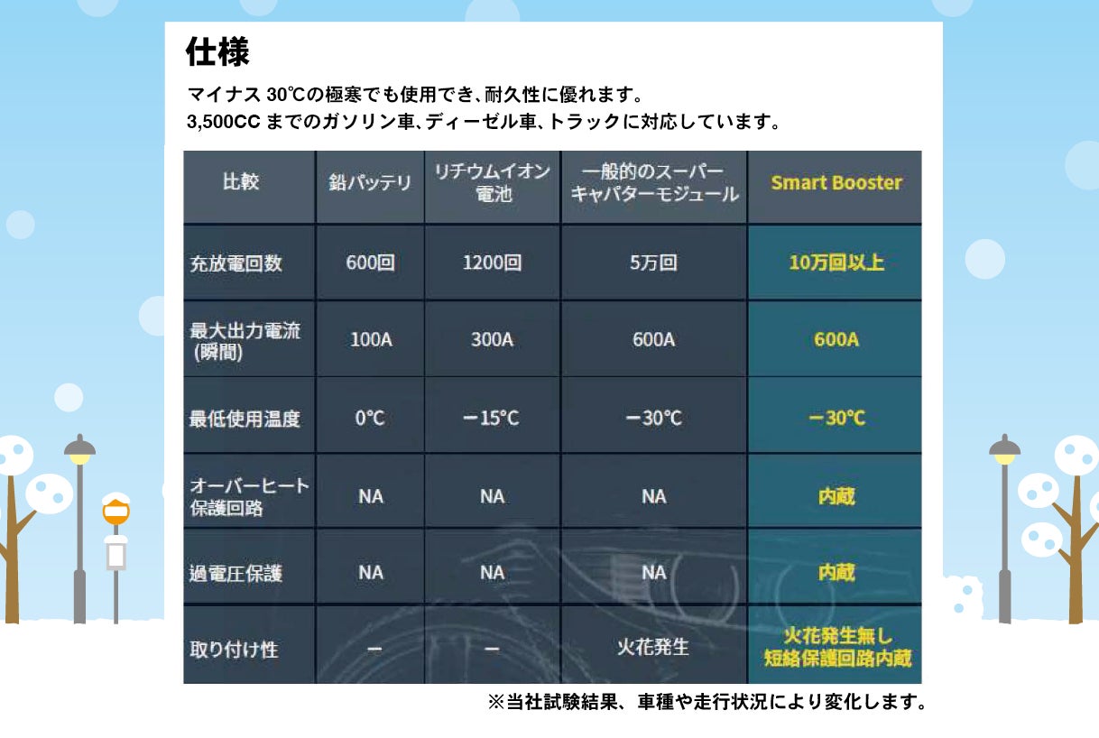 ・バッテリー上がり時もバッテリーに残った電圧を昇圧しセルモーターを回せる電圧をコンデンサーに生成します。