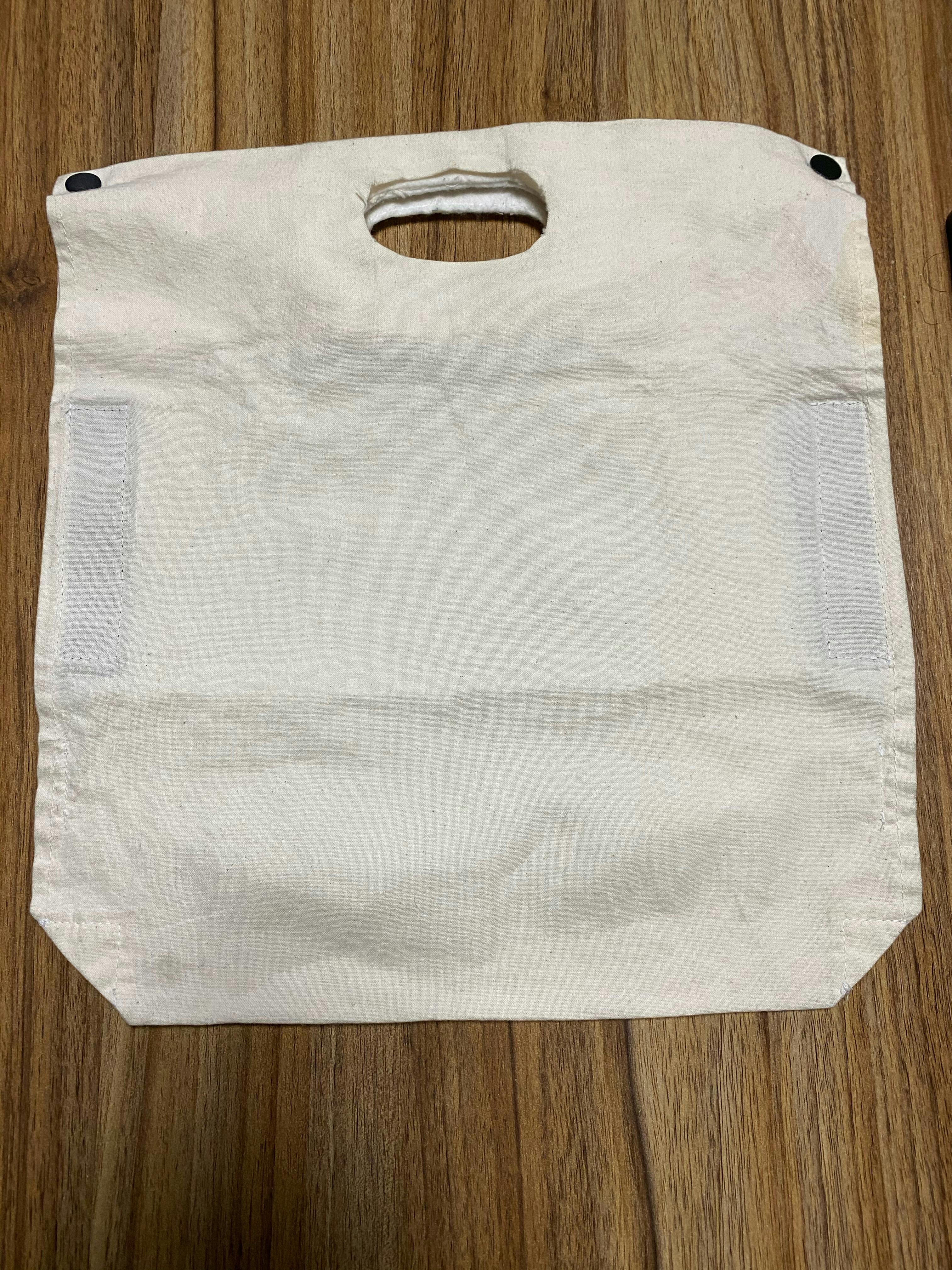 両側にマジックテープ、その上、持ち手の横にスナップボタンを取り付けてあります。このままでちょっとしたコンビニのお買い物は大丈夫だと思います。
