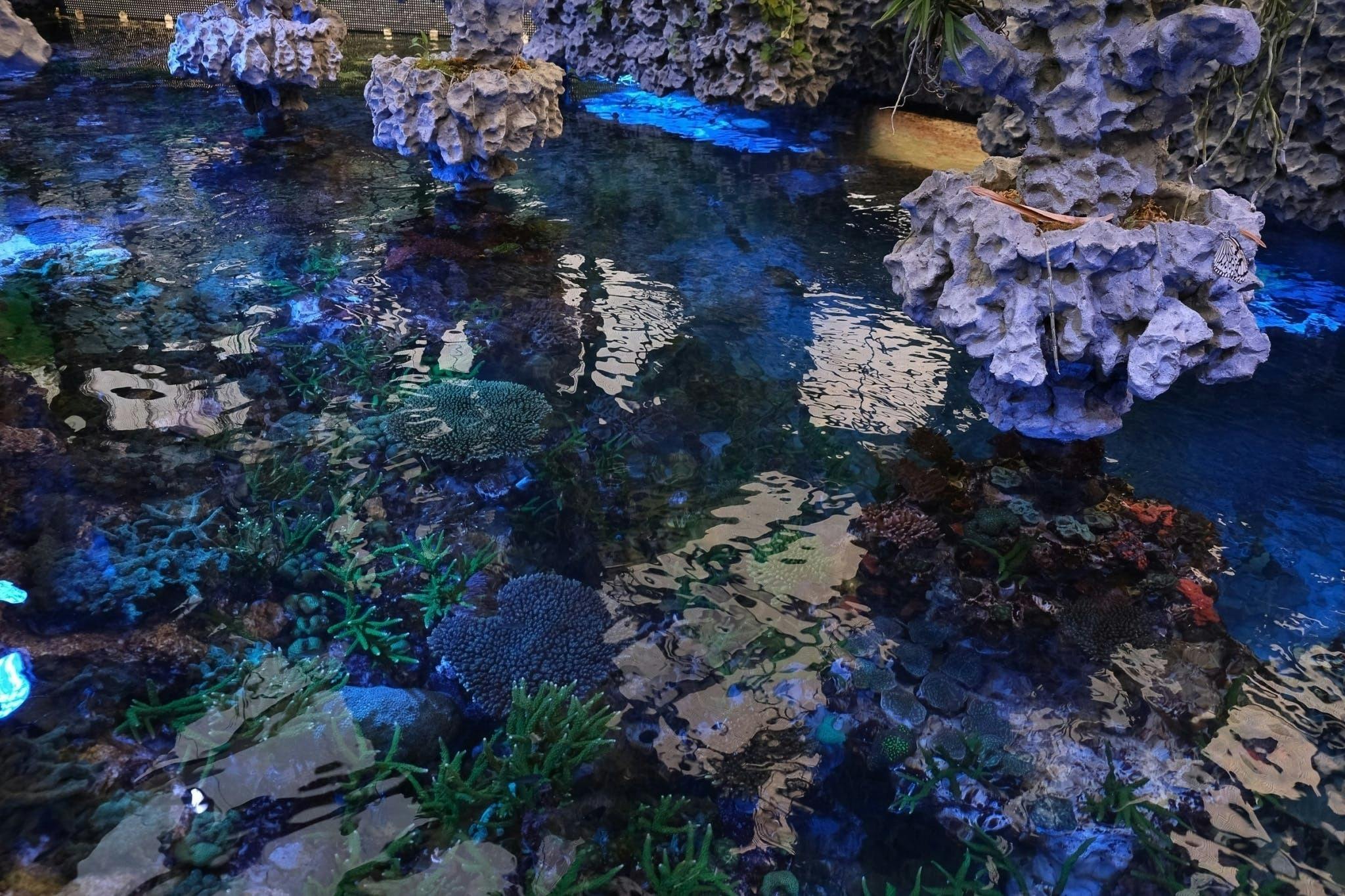 様々な植物が植えられ、蝶々やトンボが舞い、夜はブルーライトでサンゴが浮かび上がり、幻想的な景色が現れます。