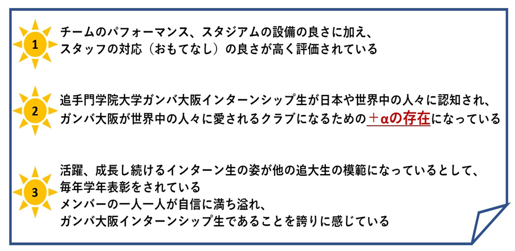 追手門学院大学ガンバ大阪インターンシップに取り組む学生は、常に目標と理念を掲げて活動に取り組んでいます。