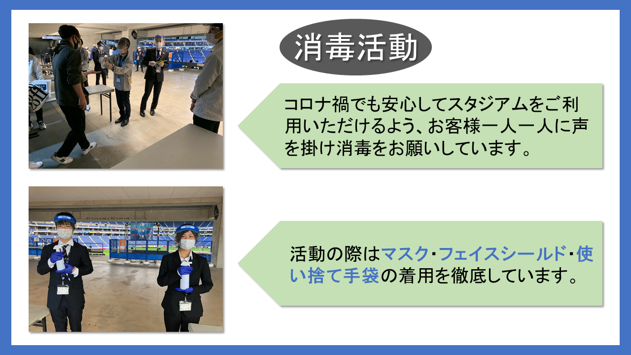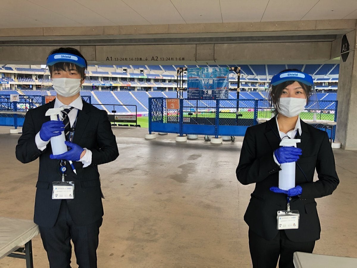 現在はお客様への消毒業務に加え、ガンバ大阪スタッフ様とともにイベントの運営、また観戦に来られるお客様へのご案内などを行っています。