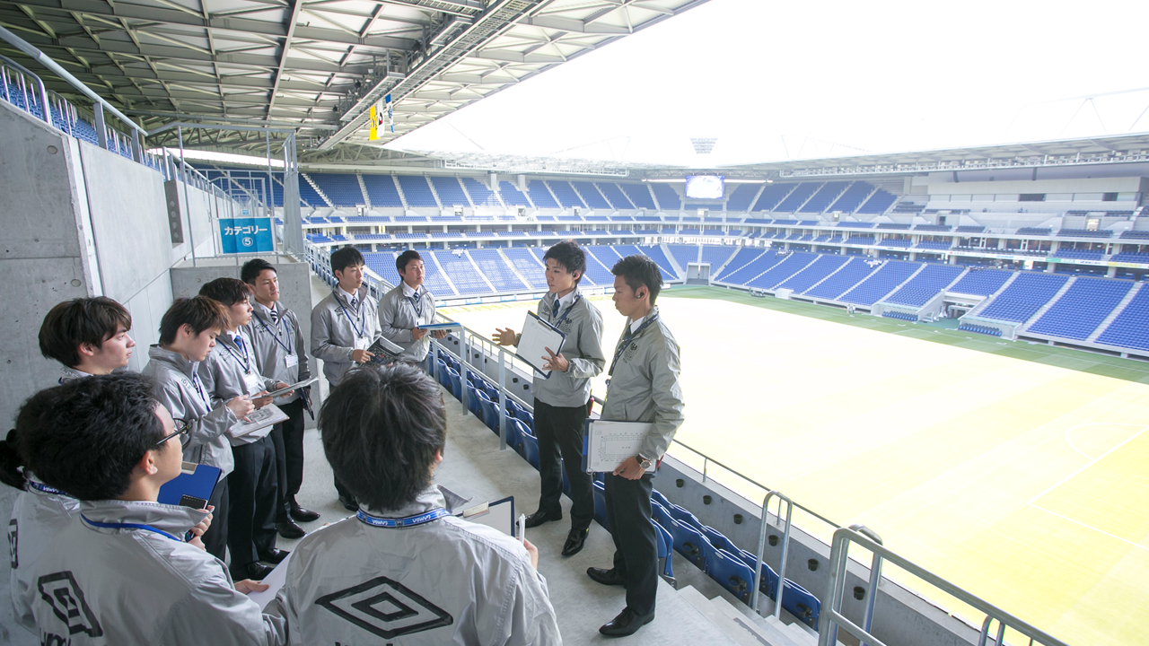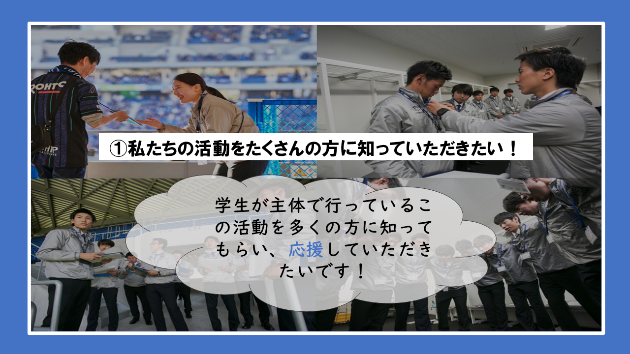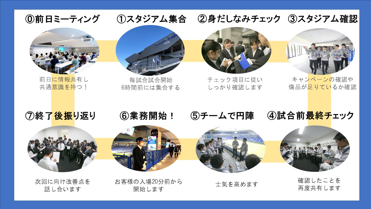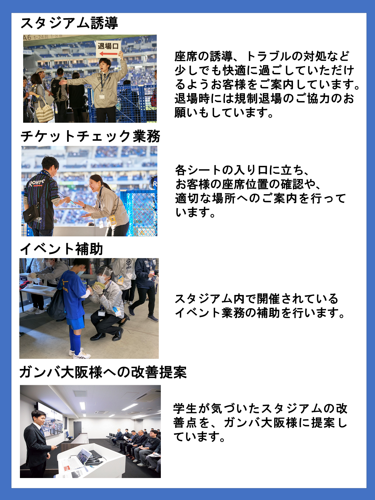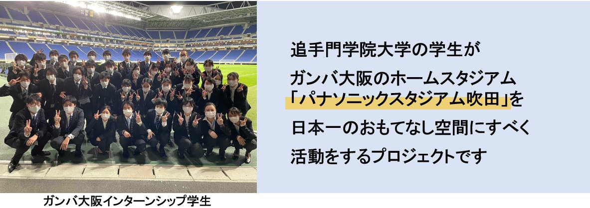 この活動では、パナソニックスタジアム吹田を「日本一おもてなしのある」スタジアムにするために、インターン生がおもてなし日本一の集団になることを目指しています。このインターンシップは、パナソニックスタジアム吹田にホームスタジアムを移した2016シーズンから開始され、多い時で50名もの学生が参加しています。