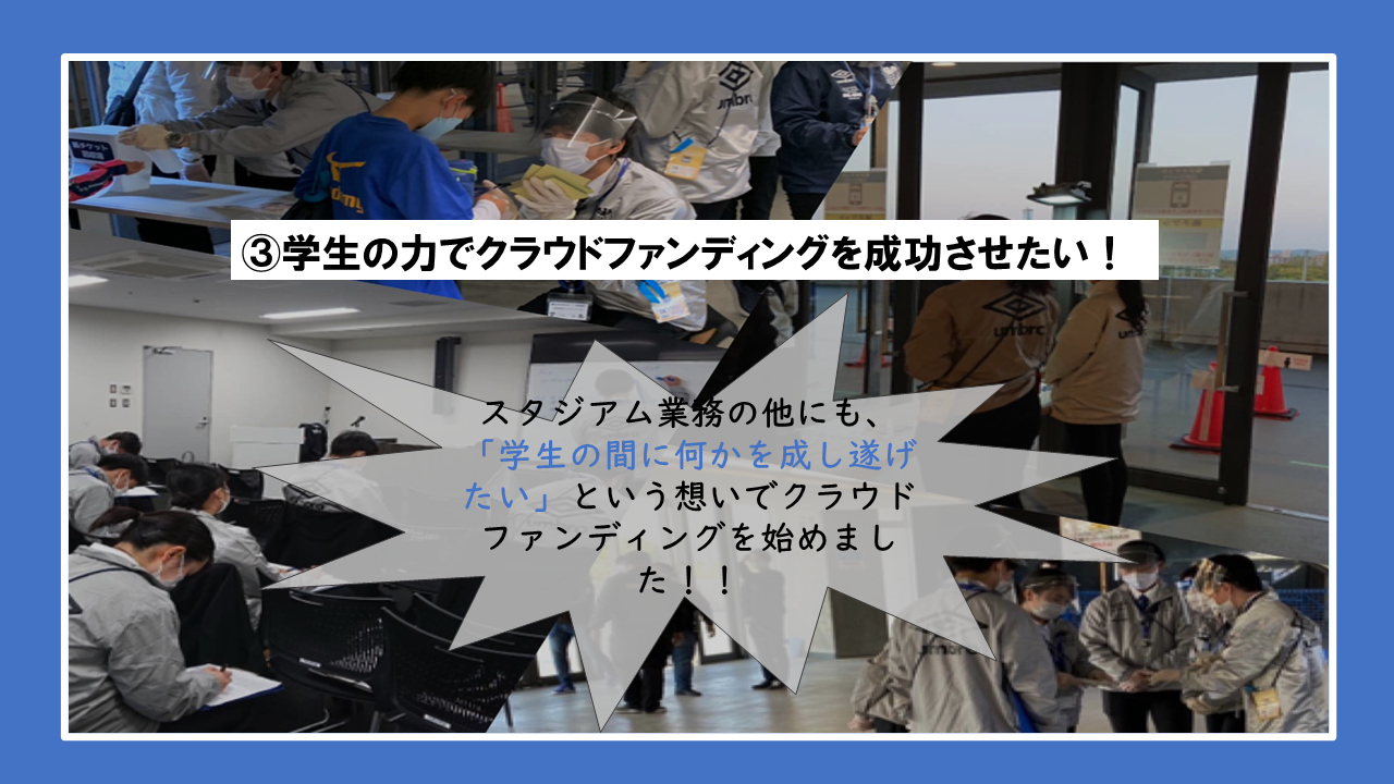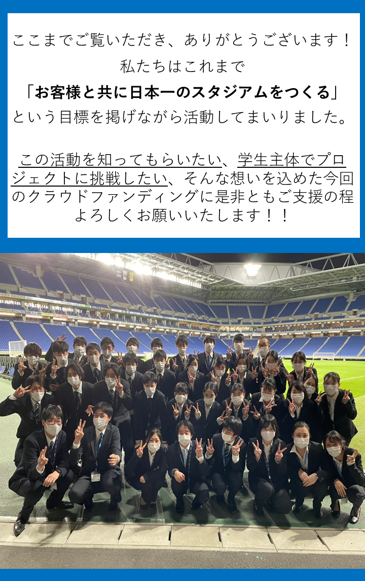 2021/07/31 14:00こんにちは!ページをご覧いただきありがとうございます!約1か月にわたる本プロジェクトが、昨日23時59分を持ちまして終了いたしました。気になる支援金額についてですが、、、皆様のお力添えのおかげで、見事目標金額である75万円を達成することができました!!最終支援総額は759,000円、達成率101%、支援者数は77人となりました。プロジェクトを立ち上げた当初は、本当に達成することができるのか不安でいっぱいでしたが、プロジェクト期間中、支援者様から数多くの応援メッセージをいただき、インターン生一同本当に励まされておりました。温かく応援してくださった皆様、お力添え本当にありがとうございました。本プロジェクトで集めた支援金につきましては、新しいインカムの購入費用として使わせていただきます。購入した際には改めてご報告させていただきますので、よろしくお願いいたします。リターンの発送・実施につきましては現在準備を進めておりますので、もうしばらくお待ちください。改めまして応援・ご支援いただきました皆様、誠にありがとうございました。私たち追手門学院大学ガンバ大阪インターンシップ生は、これからも「日本一のおもてなし」を目指して活動して参りますので、引き続き応援の程よろしくお願いいたします。パナソニックスタジアム吹田へのご来場を心よりお待ちしております。 もっと見る