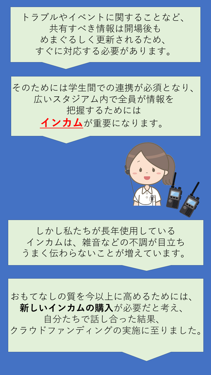 2022/05/26 16:00こんにちは!追手門学院大学ガンバ大阪インターンシップ生です!昨年度行いました、クラウドファンディングでの皆様のご支援にて、新しいインカムを購入させていただきました。これまで使用していたインカムでは音声が途切れるなどの不具合がありましたが、新しいインカムはとても音声がクリアで、スタジアム内でトラブルが起こった際も滞りなく情報共有ができ、これまでよりも迅速にご対応できるようになりました!私たちインターンシップ生は、ガンバ大阪インターンシップの活動を開始した当初から「お客様と共に日本一のスタジアムをつくる」という目標を掲げております。それを達成するための一つの手段として、今回インカムを買い替えることができたのは、「日本一のおもてなし」のための大きな一歩であると思っております。この一歩を踏み出すことができたのは、ご支援してくださった皆様をはじめ、インターンシップを応援してくださっている方々やガンバ大阪のサポーターの皆様のおかげ以外の何ものでもありません。本当にありがとうございます。ただ、「最高のおもてなし」「日本一のスタジアムにする」ということにゴールはありません。私たちインターンシップ生は現状に満足することなく、『「日本一のスタジアム」にするためには』と常に向き合い、課題の発見・改善をしております。今後も、目標に近づくために全力を尽くしてまいります。そして、ガンバ大阪インターンシップは、代々後輩に受け継いでおります。変わらぬ温かいご声援をいただけますと幸いです。今後とも、追手門学院大学ガンバ大阪インターンシップをよろしくお願いいたします。最後にはなりますが、今回のクラウドファンディングにてご支援くださった皆様、拡散をしていただきました皆様、改めて感謝申し上げます。パナソニックスタジアム吹田へのご来場を心よりお待ちしております! もっと見る