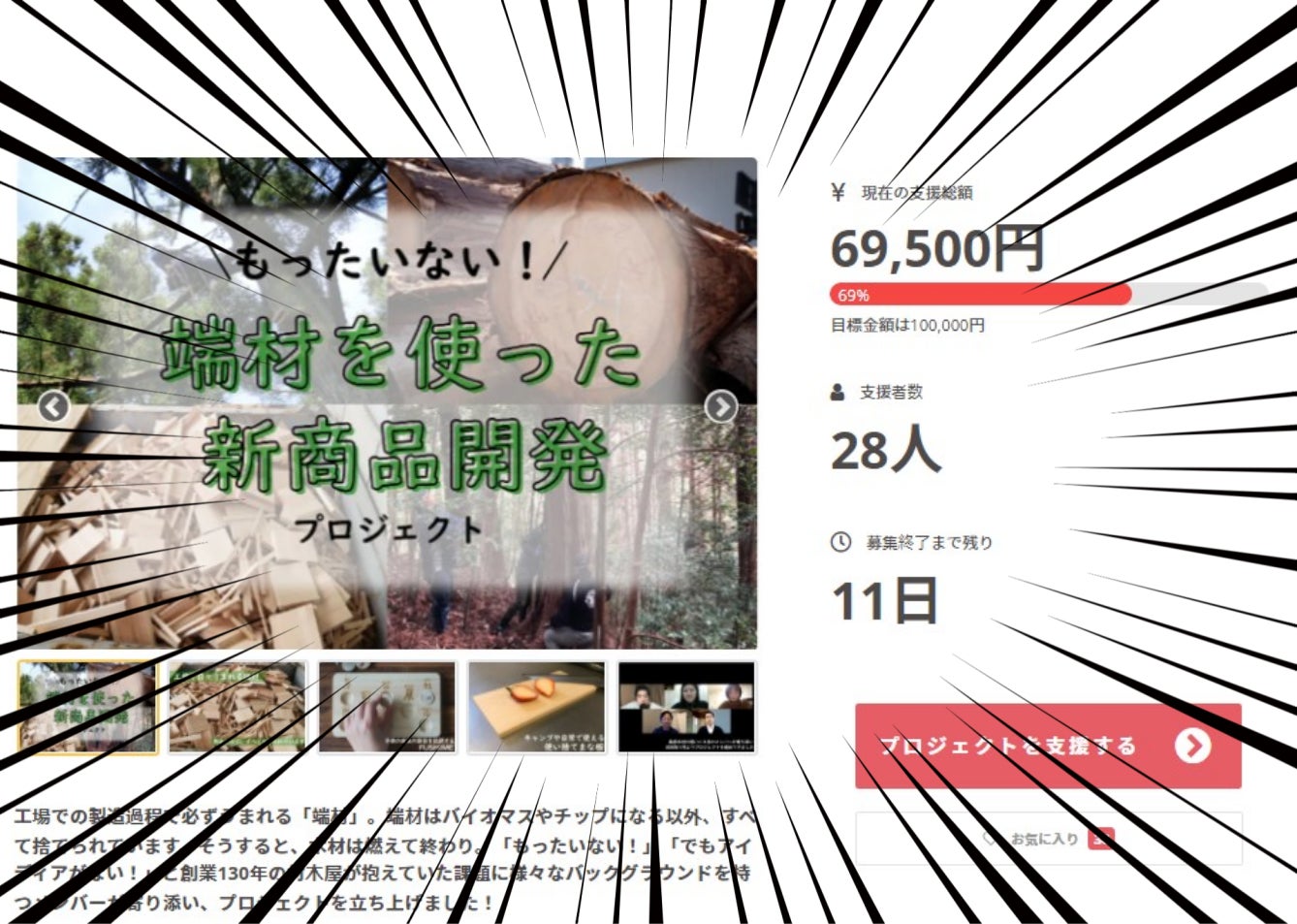 こんにちは。桑原木材株式会社です。ご支援、ご友人やSNSなどで拡散いただきました皆様、本当にありがとうございます。4月1日から開始した、わたしたちのプロジェクトが残り1日となりました。皆様からのご支援により、目標金額の90%以上となりました!わたしたちの思いに共感してくれた方が増えていることを実感し、とてもうれしく思います。リターン品はどれも7月発送としておりますが、6月中の発送を目安に現在準備を進めています。目標達成まであと少し、ご協力いただけますと嬉しいです!木材が好きな方、環境配慮やSDGsに興味がある方が周りにいらっしゃったら「愛知県の材木屋がなんかおもしろいプロジェクトやってるよ!」と広めていただけたらと思います!よろしくお願いいたします。