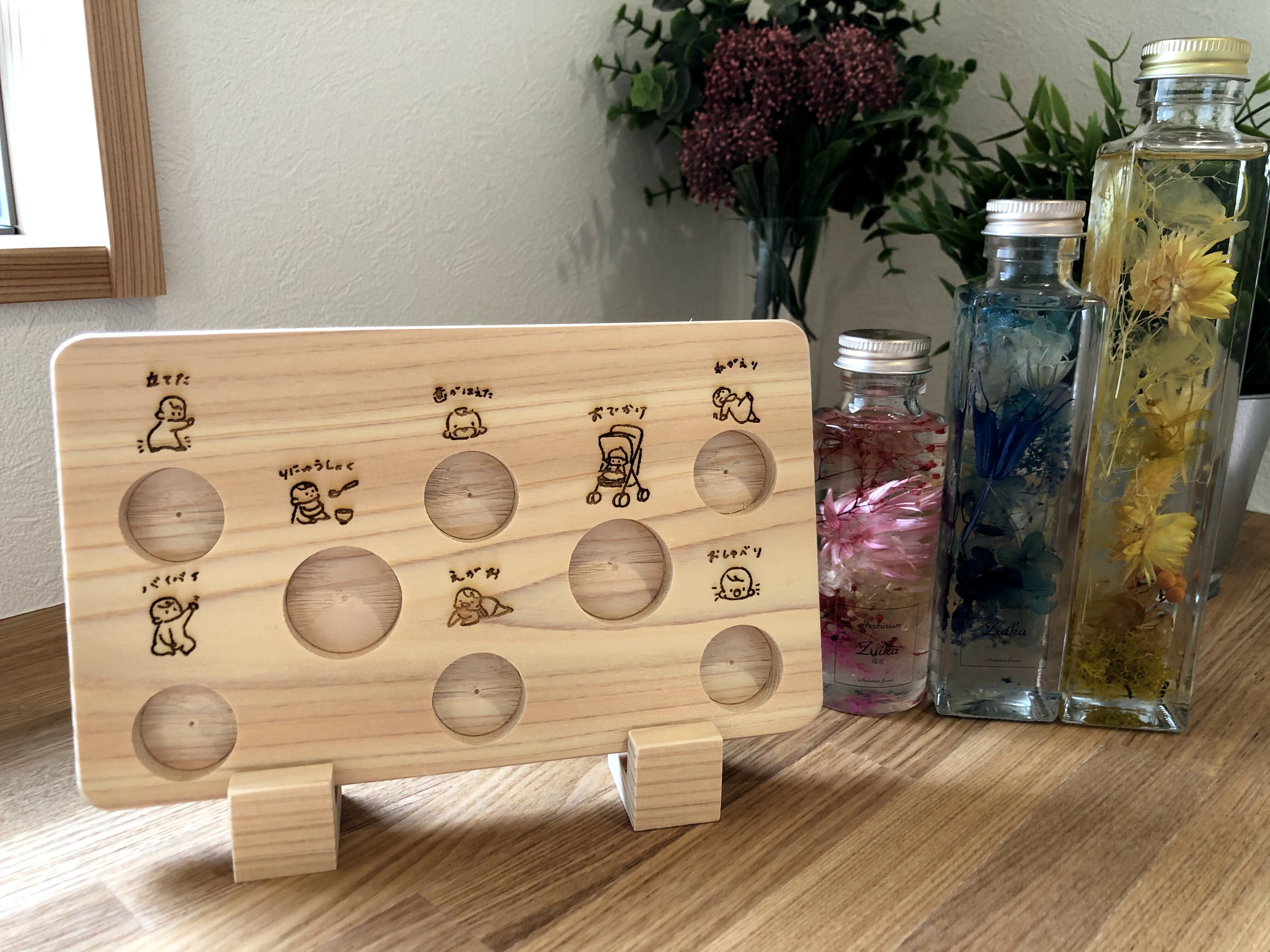 こんにちは。桑原木材株式会社です。本日は、リターン品のFUSHIMEについてご紹介します。FUSHIMEとはFUSHIME(ふしめ)は、子どもの成長の節目を記録することができるメモリーボードです。赤ちゃんの成長はめまぐるしく、毎日できることが増えていきます。「はじめてのおでかけ」「はじめての寝返り」「はじめて笑ったとき」、、、などたくさんの「はじめて」を経験します。FUSHIMEはその「はじめて」を記録し、残すことができます。子どもが「はじめて」を経験したその日付を付属の節に記入し、ボードに埋めることで成長を記録します。記録する思い出は、メンバーの周りにいるお父さん・お母さんを対象にアンケートを実施して、選びました。記憶に残っている思い出と記憶に残しておきたかった思い出として票の多かった8項目をかわいいイラストとともに残すことができます。FUSHIMEが誕生するまでわたしたち桑原木材には、フローリングや天井材などの住宅の内装材を加工している加工工場があります。プロジェクトが始動した11月の初め、メンバーとともに加工工場を見学しました。どのような端材がどのような工程で生まれているのか見学していただきました。FUSHIMEに付属する節のパーツは、節のあるフローリングを補修するために工場で使用しているもので、節も端材を利用してできています。メンバーの1人がこの節のパーツを使って何か商品ができるのではないか、と考えたのがFUSHIME誕生のきっかけでした。節を穴のあいたボードに埋めることで何か記録することができるのではないか、木は年輪を重ねるように成長するからぐんぐん成長する子どもの成長を記録出来たらおもしろいのではないか、、、といった意見交換をして、FUSHIMEが誕生しました。また、友達にあげる出産祝いの定番、おむつケーキやよだれかけ、洋服は別の友人と被ってしまう、、、「木育」という言葉があるように木のおもちゃをあげたい、、、という悩みもあったそうです。自分の子どもにも周りの友達への出産祝いとしてあげられるように、、、、桧の香りがお家に広がることで家族がリラックスできればいいな、、、そんな思いも込めて形にしました。ぜひ手に取ってFUSHIMEがもたらす桧の豊かな香り、優しい手触りをお楽しみください。