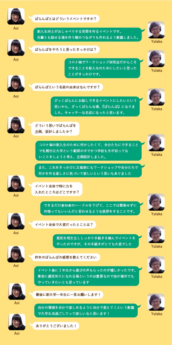 実は、私が所属している札幌市立大学にて、「ばらんば」を昨年2020年度の4月、緊急事態宣言下にいち早く行うことができました。そこでは札幌市立大学の新1年生を対象に、交流をうむことができる場を作ることができ、新入生に大いに役に立つ場となりました。下記画像はその際に用いた広報の画像となります。