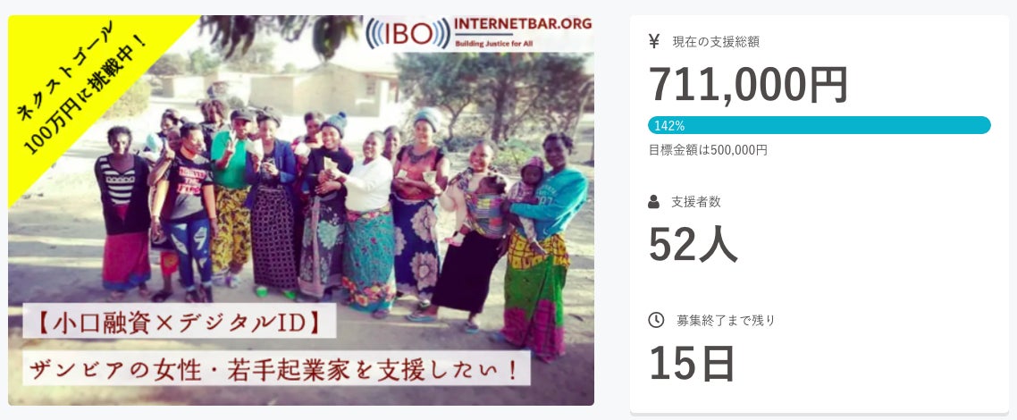 こんにちは、IBO Japanチームです。4月11日 23時59分をもって、「【小口融資 × デジタルID】ザンビアの女性・若手起業家を支援したい!」のクラウドファンディングが終了いたしました。募集期間を通して58名の方からのご支援を賜り、目標金額の150%となる 751,000 円を達成しました!!ご支援・ご協力いただいた全ての皆様に、心から感謝申し上げます。本当にありがとうございました。2020年1月のプロジェクト立ち上げから、現地ザンビアでのNPO法人設立やコミュニティ開発などを経て、ようやく今回のクラウドファンディングを始動させることができました。36日間で50万円というゴールは、私たちにとって今までにないとても大きな挑戦でしたが、想像を遥かに超えるご支援をいただき本当に嬉しい限りです。約1ヶ月の募集期間中、ご支援いただいた皆様からのメッセージやSNSなどで応援してくださる皆様の言葉を拝見し、改めてこのプロジェクトの意義と、皆様の想いを実行する責任を再認識しております。皆様からいただいたご支援は、小口融資とデジタルIDによるザンビアの雇用問題改善に向けて、女性・若者起業家のエンパワーメントのために、大切に使わさせていただきます。【リターンの配送スケジュール】ご支援いただいた皆様へのリターン送付スケジュールは以下の通りとなります。ご支援いただいたプランをご確認のうえ、送付予定日をご確認ください。詳細は後日メールにてお伝えさせていただきます。・2021年5月    ザンビア現地からのThank youムービーを送付・2021年6月    本プロジェクトの詳細な活動報告書(pdf形式)を送付、IBO ZambiaのFacebookグループにご招待・2021年8月    ザンビアの工芸品を送付・2021年9月    オンライン座談会、分散型ID体験会にご招待IBOはこれからも「Building Justice for All」をミッションに掲げ、デジタルIDをはじめとしたテクノロジーを通して途上国支援を目指していきます。皆様からいただいた想いを胸に、現地ザンビアのスタッフとともにプロジェクトを形にしていきますので、今後ともよろしくお願いいたします!IBO Japan安田クリスチーナ、嶋田幹大