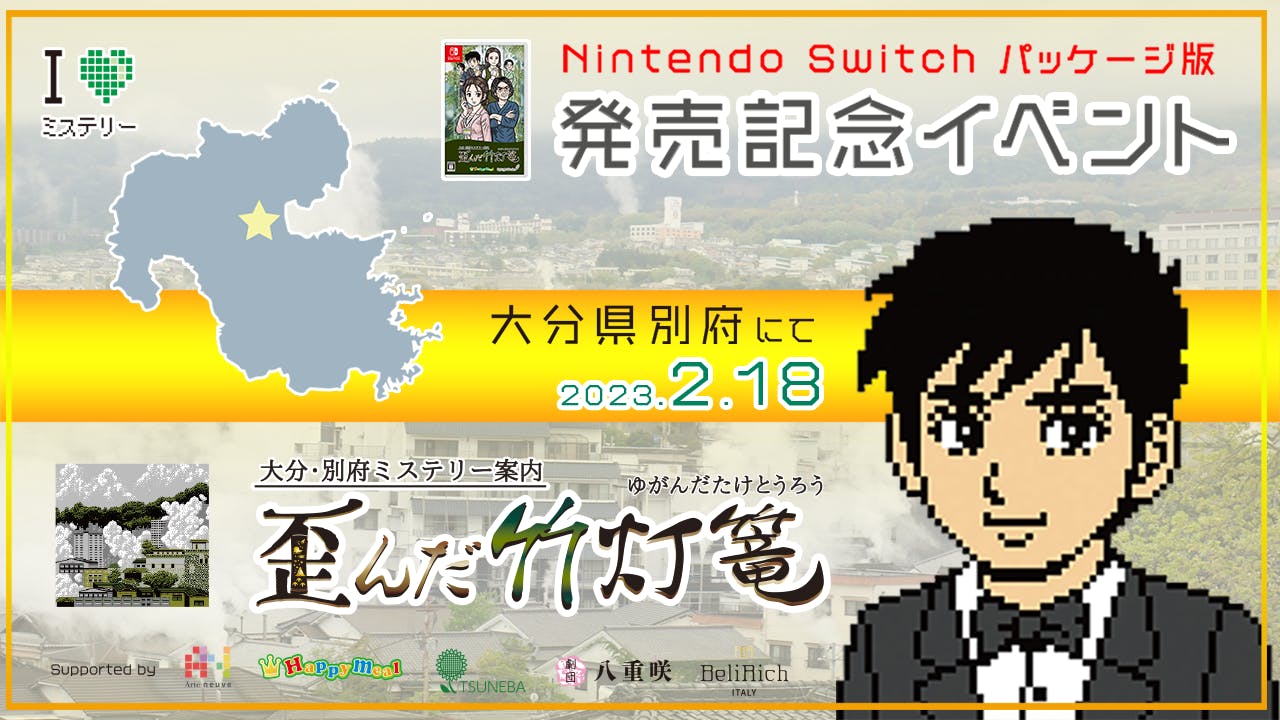 この度、2023年2月22日発売予定のNintendo Switch パッケージ版『ミステリー案内』シリーズ第3弾『大分・別府ミステリー案内 歪んだ竹灯篭』の発売記念イベントを2023年2月18日(土)15:00~開催します事をお知らせ致します。また、本イベントの会場ではパッケージ版を先行販売!ひと足早くソフトをご購入頂けます。(※数量限定)