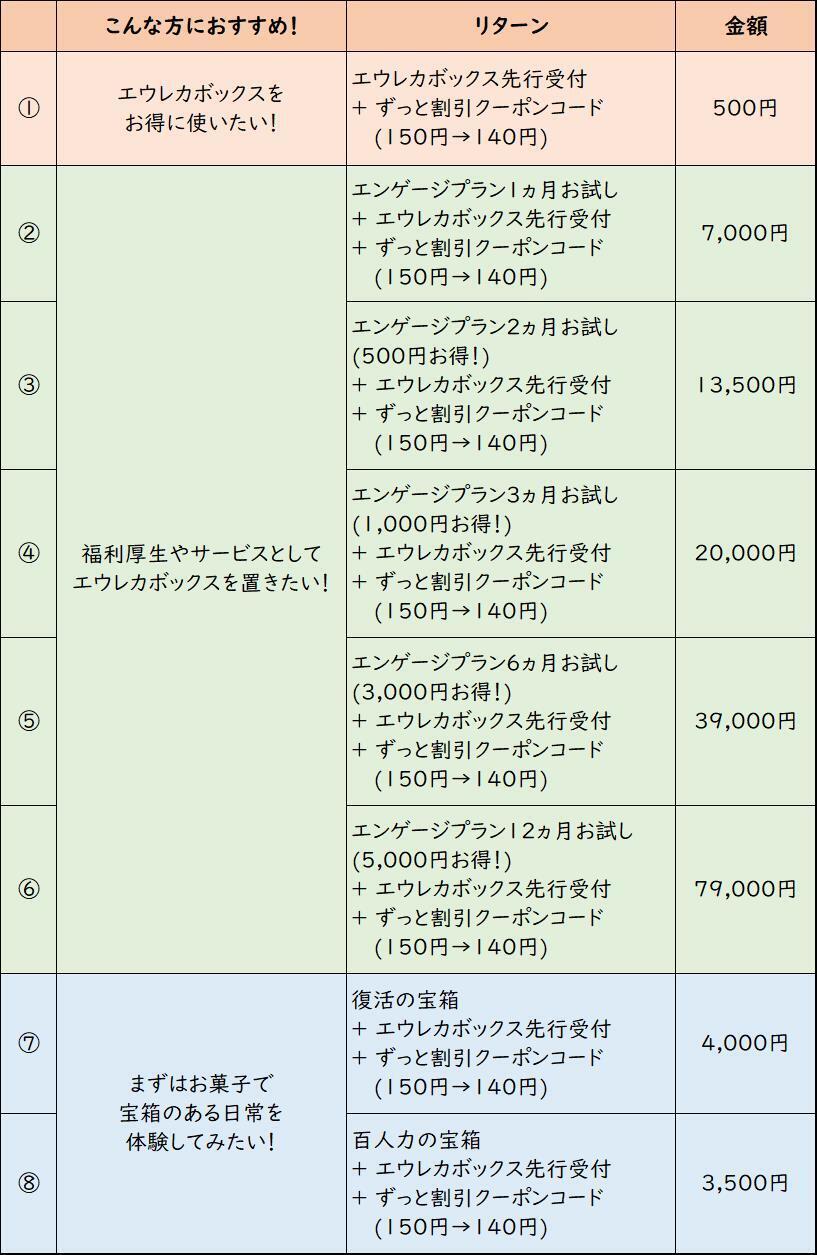 全てのリターンで通常2021年7月から受付を開始するエウレカボックスの先行申込権 + 「基本プラン」お申し込み時に使える、ずっと割引クーポンコード(1クーポンで適用できる場所は1か所まで)を含みます。