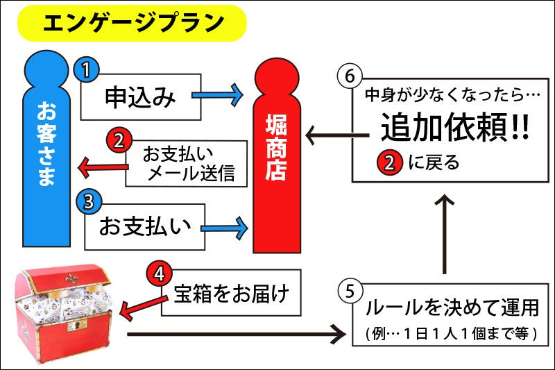 A. 在庫管理は不要です。おもちゃが少なくなって物足りなくなったら、宝箱に貼り付けてあるバーコードを読み込んで、追加のご依頼をください。2-3日でおもちゃ50個をお届けします。