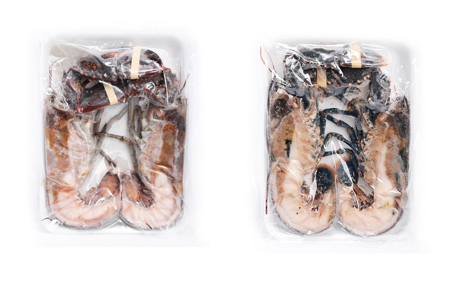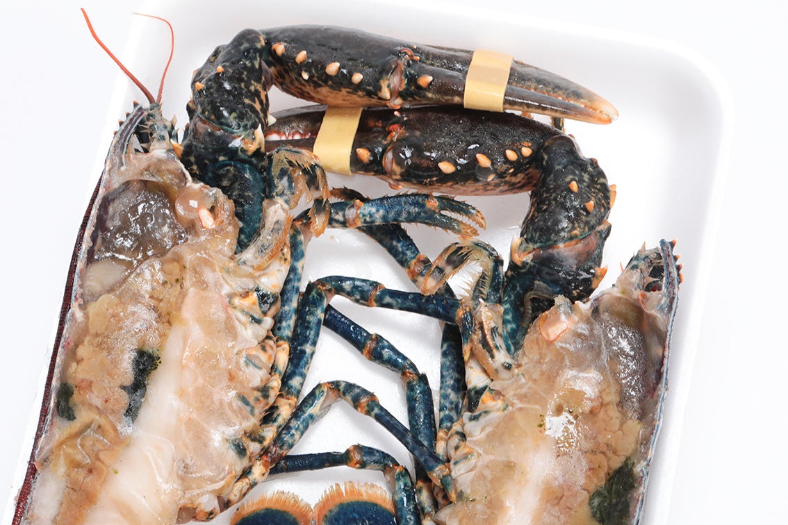 オマールの最高峰、高級食材の活オマールブルーを ハーフカットし、真空パックして冷凍しています。