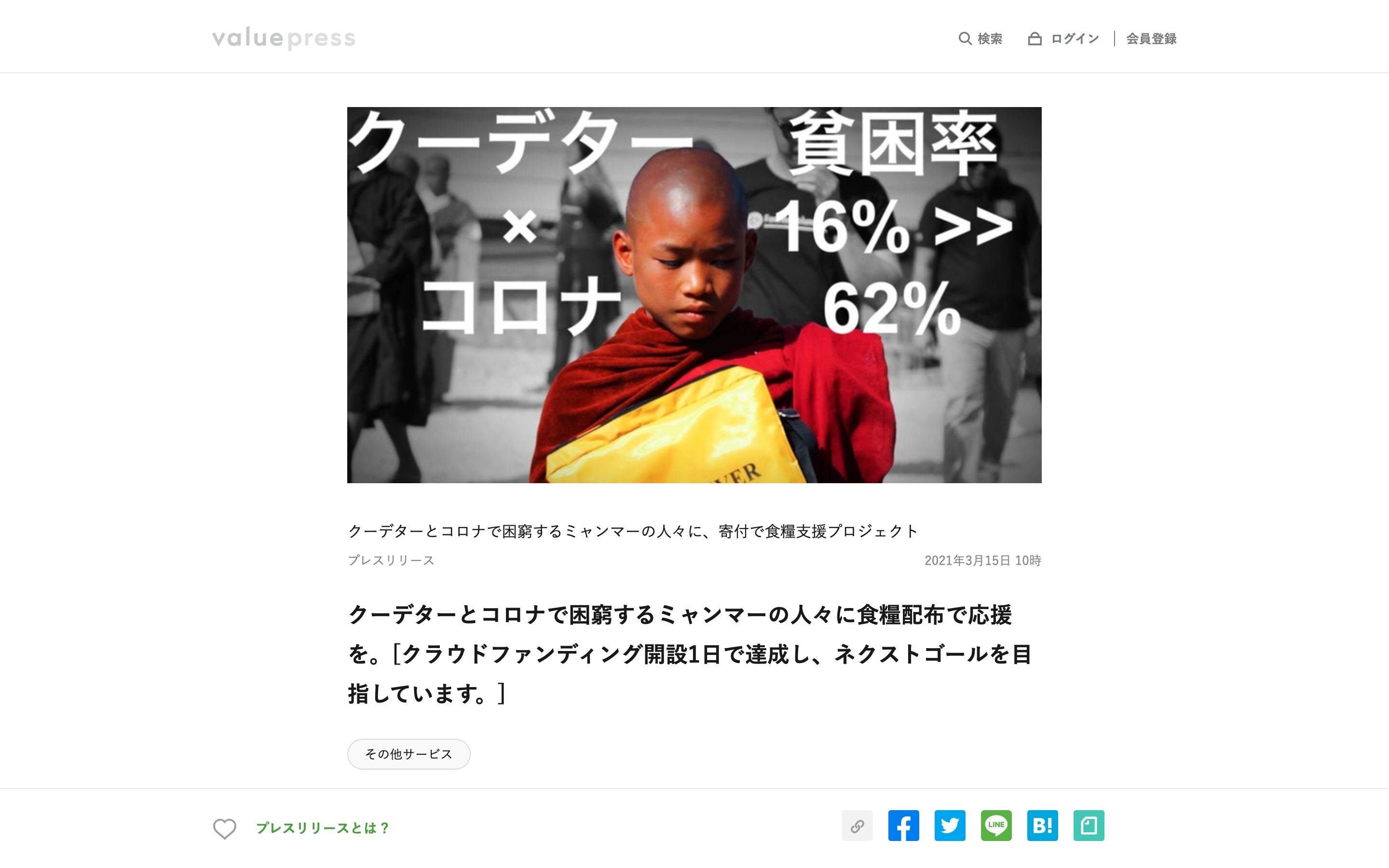 Valuepressにて、本クラウドファンディングのプレスリリースを配信致しました。貧困率62%という大きな壁を前に、引き続き支援拡大を目指し、運営メンバー一同活動して参ります。差し支えなければシェアや応援ボタンプッシュなどご協力いただけますと幸いです。何卒よろしくお願い申し上げます。