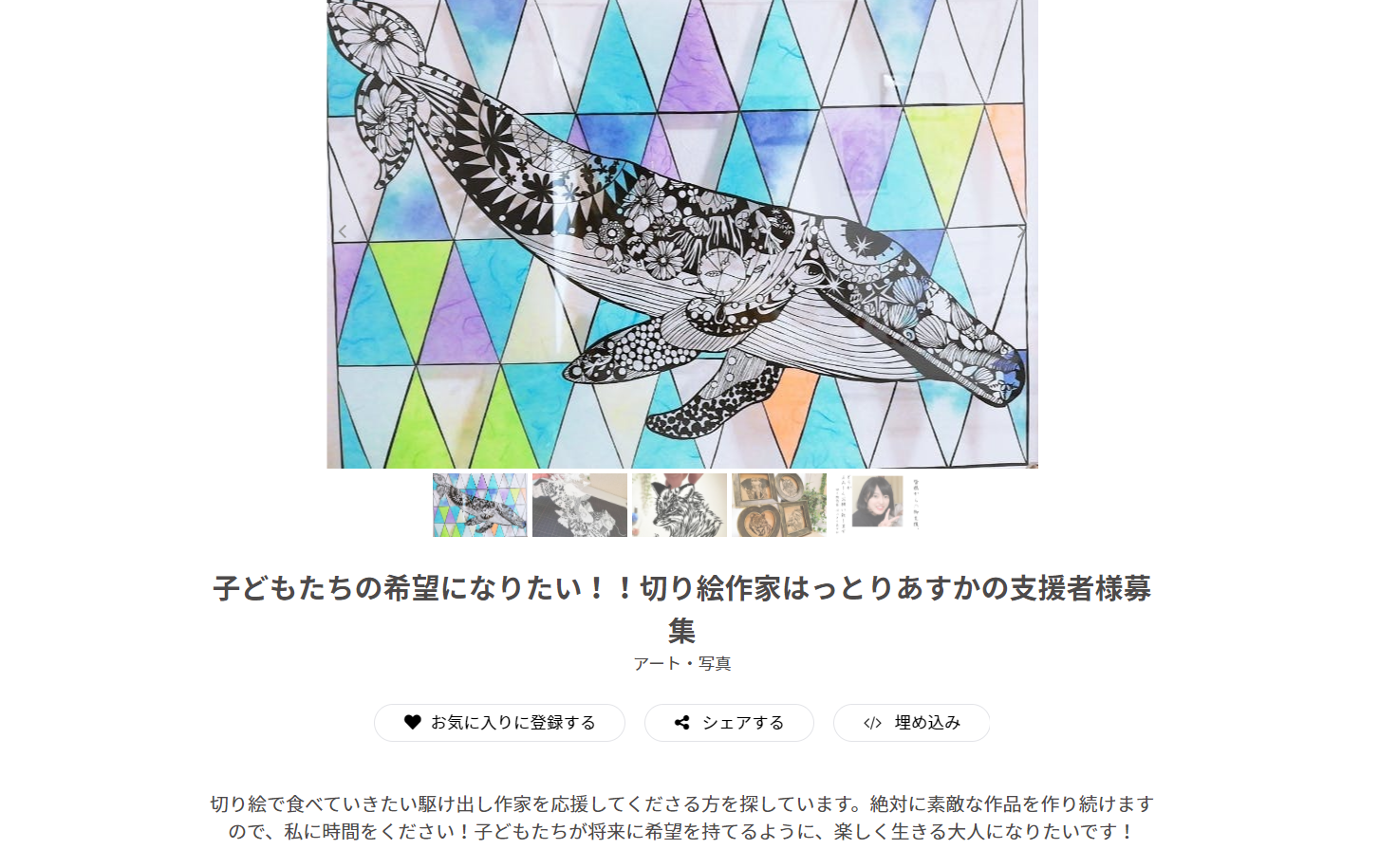 2021/05/21 17:55お世話になっております。切り絵作家のはっとりです!!先ほど、本プロジェクトが成功しました!!皆様のおかげでございます。興奮が冷めやらぬまま、この文章を書いています。残り2日の段階で、達成率が70%でしたので、「あぁ・・・ダメかなぁ・・・」と思っていましたが、達成することができて本当に嬉しいです(;_;)娘が寝返りできるようになったのと同じくらい嬉しいです!取り急ぎ、・リターンの準備、配送・アート教室の準備に取り掛からせていただきたいと思います。アート教室の詳細な日時が決定いたしましたら、SNS等でお知らせさせていただきたいと思います。皆様のおかげで、佐世保の子どもたちにアート体験をプレゼントすることができます(;_;)子どもたちがこの夏に、一番の思い出を作ることができるように、全力を尽くしたいと思います。もちろん、感染対策は徹底して行います。このたびは誠にありがとうございました!! もっと見る