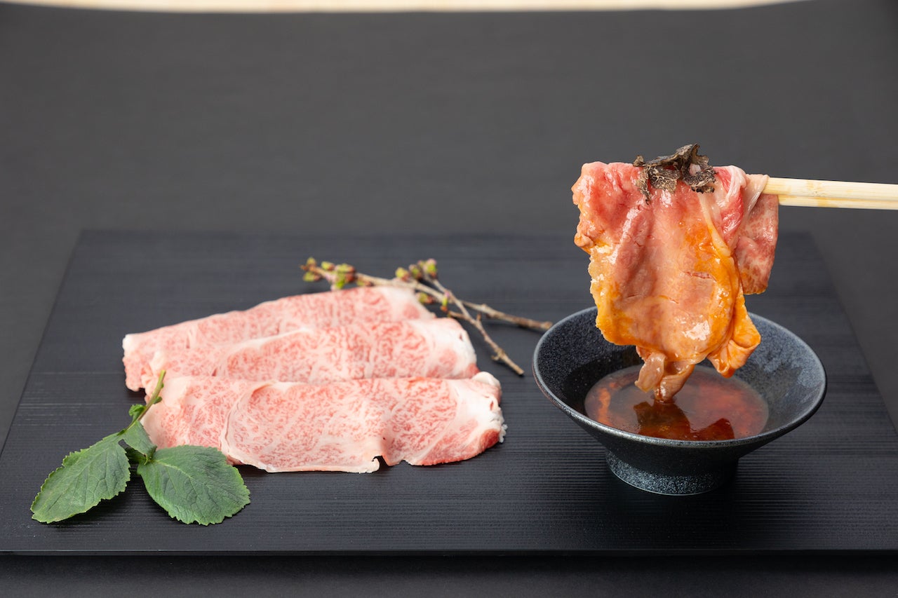 きめ細かい脂の乗ったロース、大分より直送していただくこだわりの卵を4時間かけて完成させる割下とふんだんのトリュフと共に。