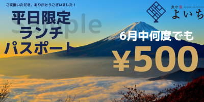 魚やよいち自慢のランチ(通常850円~)が平日毎日どれでも500円で食べられるヘビーユーザーに超ありがたいパスポートです。ランチメニューの種類も豊富なので毎日でも飽きることなく楽しめるよいちのランチを心ゆくまでお楽しみください。