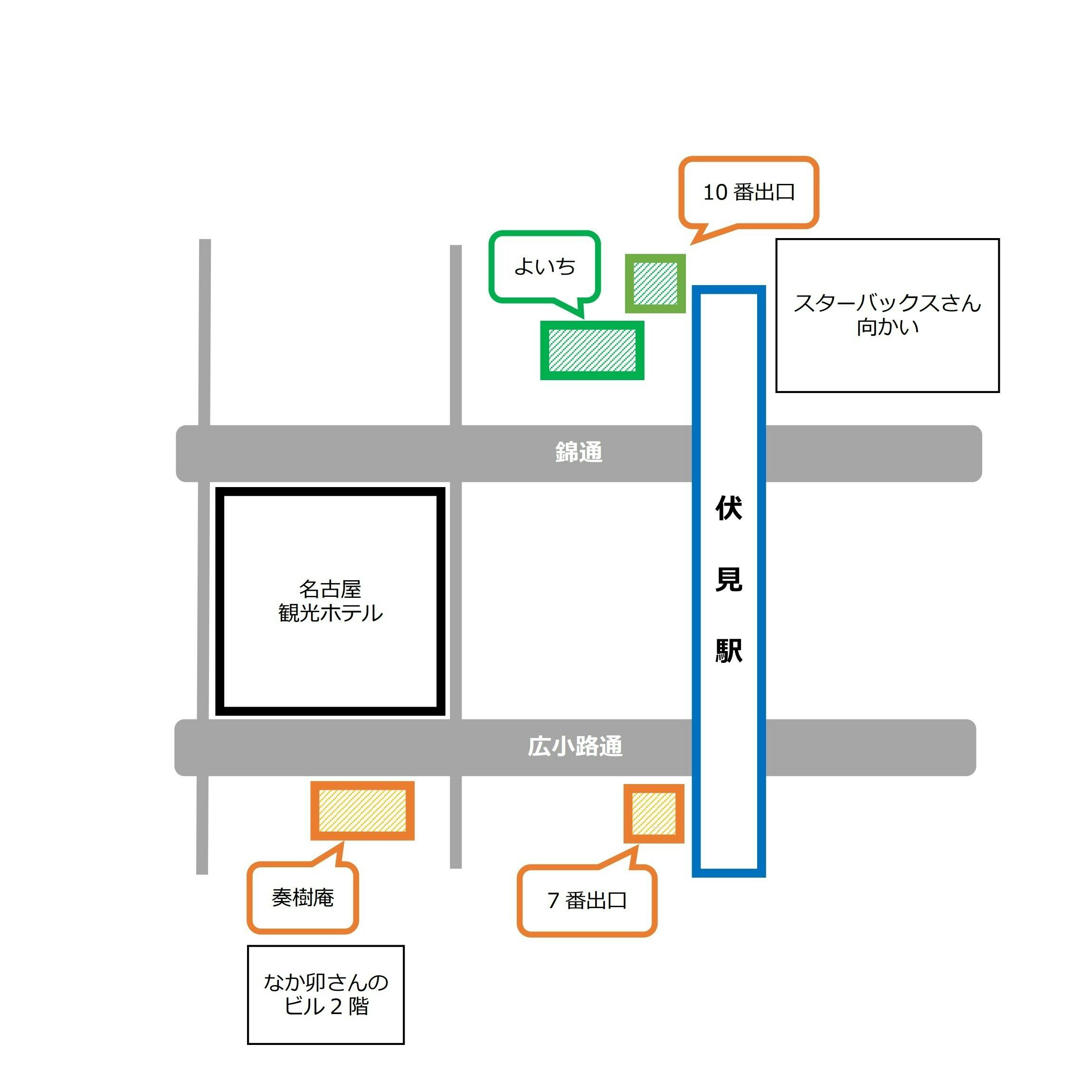 2021/05/02 12:53お店がどこにあるのか知りたいという声を頂きましたので地図を作成してみました。奏樹庵とよいちは、伏見駅からすぐ近くにあります。奏樹庵は、伏見駅7番出口より広小路通をまっすぐ行ったところにあります。店舗は、2階にあり広小路通沿いからは少し見えにくいところにありますが、1階には「なか卯」さんが入っていますので迷うことなくいけます(^^)よいちは、伏見駅10番出口よりすぐです。10番出口直結の名古屋インターシティビルB1Fにあります。「スターバックス」さんがすぐ向かいにあり、こちらも迷うことなくいけます(^^) ただし、10番出口は改札口を間違えるとアクセスできないので注意してください。東山線で名古屋駅からお越しいただくと真正面の改札口になります。 もっと見る