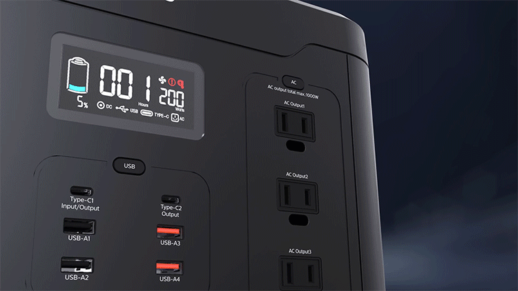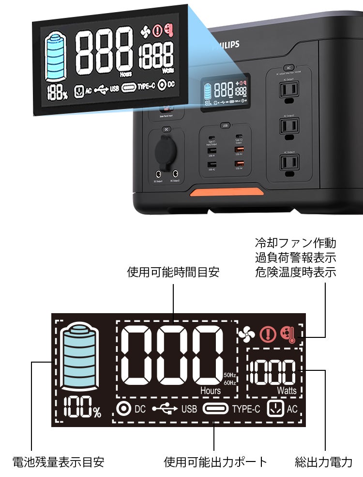 使用可能時間目安や電池残量表示目安、現在の総出力電力がLCD(液晶ディスプレイ)に表示されるため、製品本体の状態や充電のタイミングがひと目でわかります。