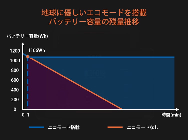 また、AC出力には充電するデバイスへの出力が1W未満の場合、1分後にすべての出力が自動オフになるエコモード機能が搭載。デバイスが満充電されたのちも、本製品から少しずつ消費される電力をカットすることで、さらに長持ちできる仕様となっております。