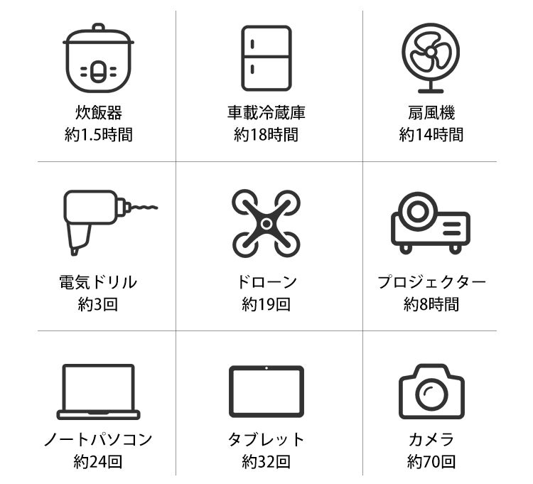 「DLP-8092C」は大容量324000mAh(1166Wh/1000W)で、日常のあらゆるニーズに応えます。変換効率90%と非常に高く、多様なポートから各製品に強力給電します。デジタルカメラなら約70回、タブレットなら32回と多用するデバイスを繰り返し充電可能。DC電源なら、車載冷蔵庫を約18時間稼働させます。