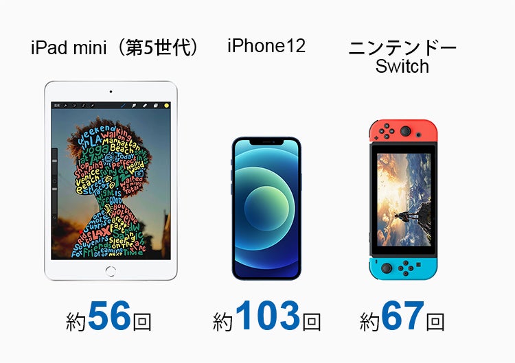 iPhone12なら約103回、iPad mini(第5世代)は約56回、ニンテンドーSwitchが約67回と、お手持ちのデバイスを何度も繰り返し充電します。