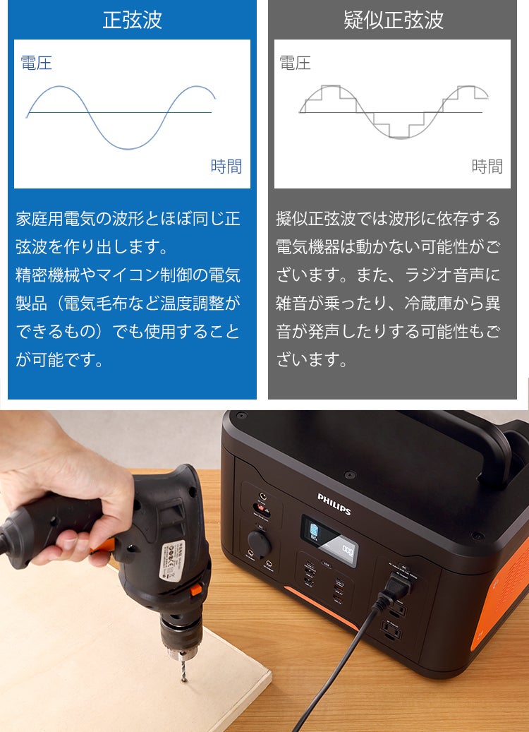 ひとつは疑似正弦波。修正正弦波とも呼ばれ、リーズナブルな製品が多いですが、プラス/マイナスが直線的に切り替わるため、明るさや電気毛布など温度調整ができる製品は動作が不安定になる性質があります。対して正弦波と呼ばれる製品は、なだらかな波形でプラス/マイナスが入れ替わり、デバイスへの電気供給が安定します。