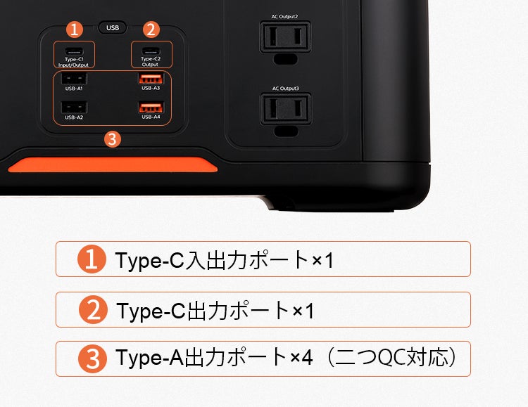 「DLP-8092C」には3種類の電源ポートがあり、ACポートが3つ、USBポート(Type-C×2、Type-A×4)が6つ、さらにDCポートが2つとシガーソケットも搭載。12端末同時に給電が可能です。