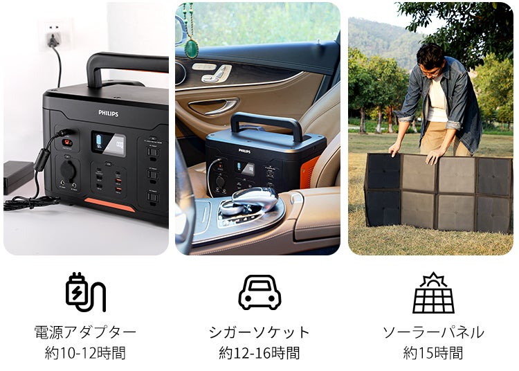 シガーソケットでの充電で約12-16時間、電源アダプターでは約10-12時間(出力100Vの場合)、ソーラーパネル(別売り)を使用の場合は約15時間で充電が完了します。