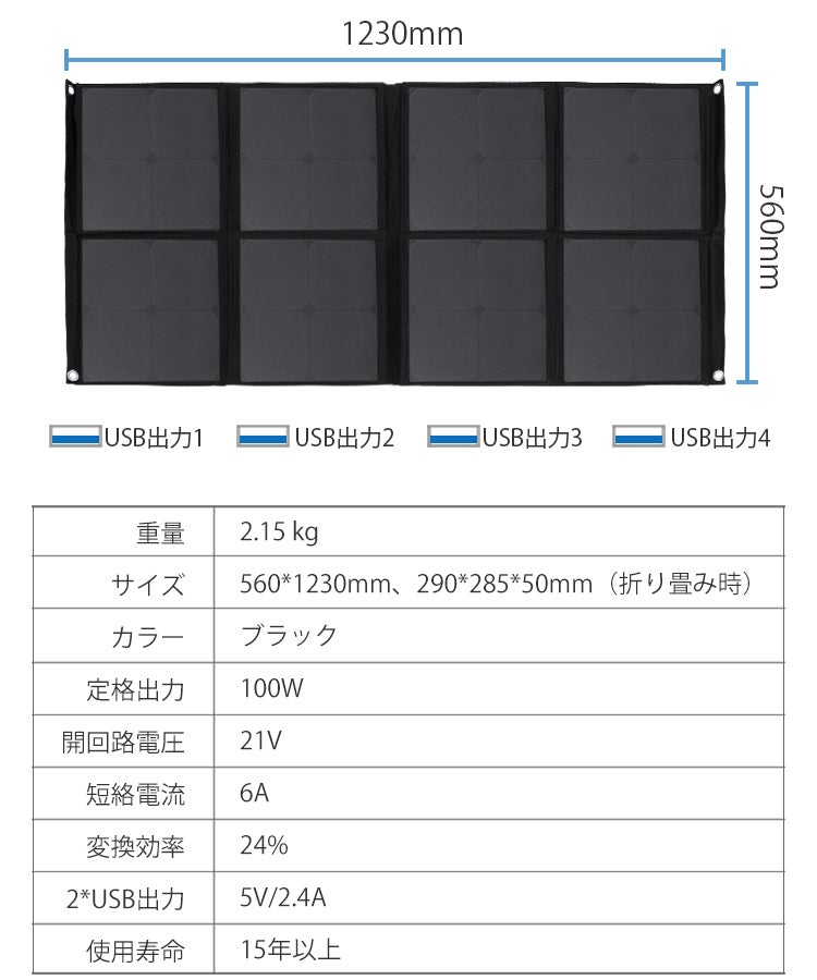 100wソーラーパネルのリターンもご用意しております。折りたたみ式はコンパクトで持ち運びにも便利です。USBポートを4つ設けており、USBケーブルでデバイスを直接充電する事が可能です。