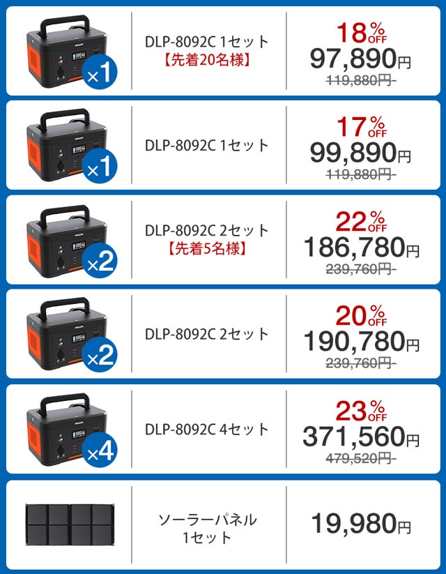 2021/04/08 13:05皆さま、こんにちは!unsyuでございます。本日、PHILIPSの最新ポータブル電源「DLP-8092C」のプロジェクトがスタートしました!PHILIPSブランド自慢の安全性と、AC×3を含む充実の12出力ポート。そして324000mAh(1166Wh) の大容量。キャンプや野外レジャーで活躍すること間違いなしの機能が満載となっております。ソーラーパネル対応で、ぜひともお日様の下で本製品を充電してほしい仕様となっております。アウトドアにも災害対策にもお薦めのポータブル電源「DLP-8092C」 。少しでも気になった方はぜひご支援、SNSなどの拡散をどうぞよろしくお願いいたします! もっと見る