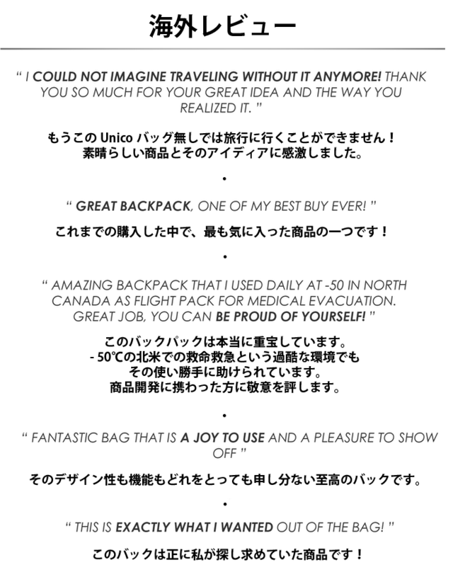 Unico Bagは、イタリアの研究開発チームによって制作されました。CEOのJacopoはデザイナーとして数十年のキャリアを持ち、パートナーのSergioは繊維メーカーにて生地の開発を行ってきました。
