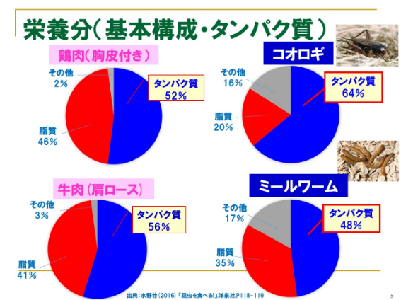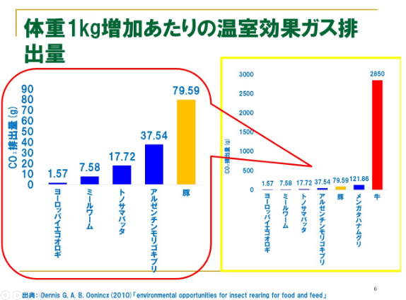 昆虫食はFAO(国連食糧農業機関)の2013年に「食用昆虫-食料及び飼料の安全保障に向けた将来の展望-」で”昆虫食が従来の家畜や飼料の代替となり、地球環境と健康と生活に有益である”ことが報告されてから徐々に注目をされ始めました。昆虫は従来の牛・豚・鶏などの家畜と比較して同等以上のタンパク質を有しながら、生産時の温暖化ガスの排出は非常に小さいため、特に環境に良いことが言われています。
