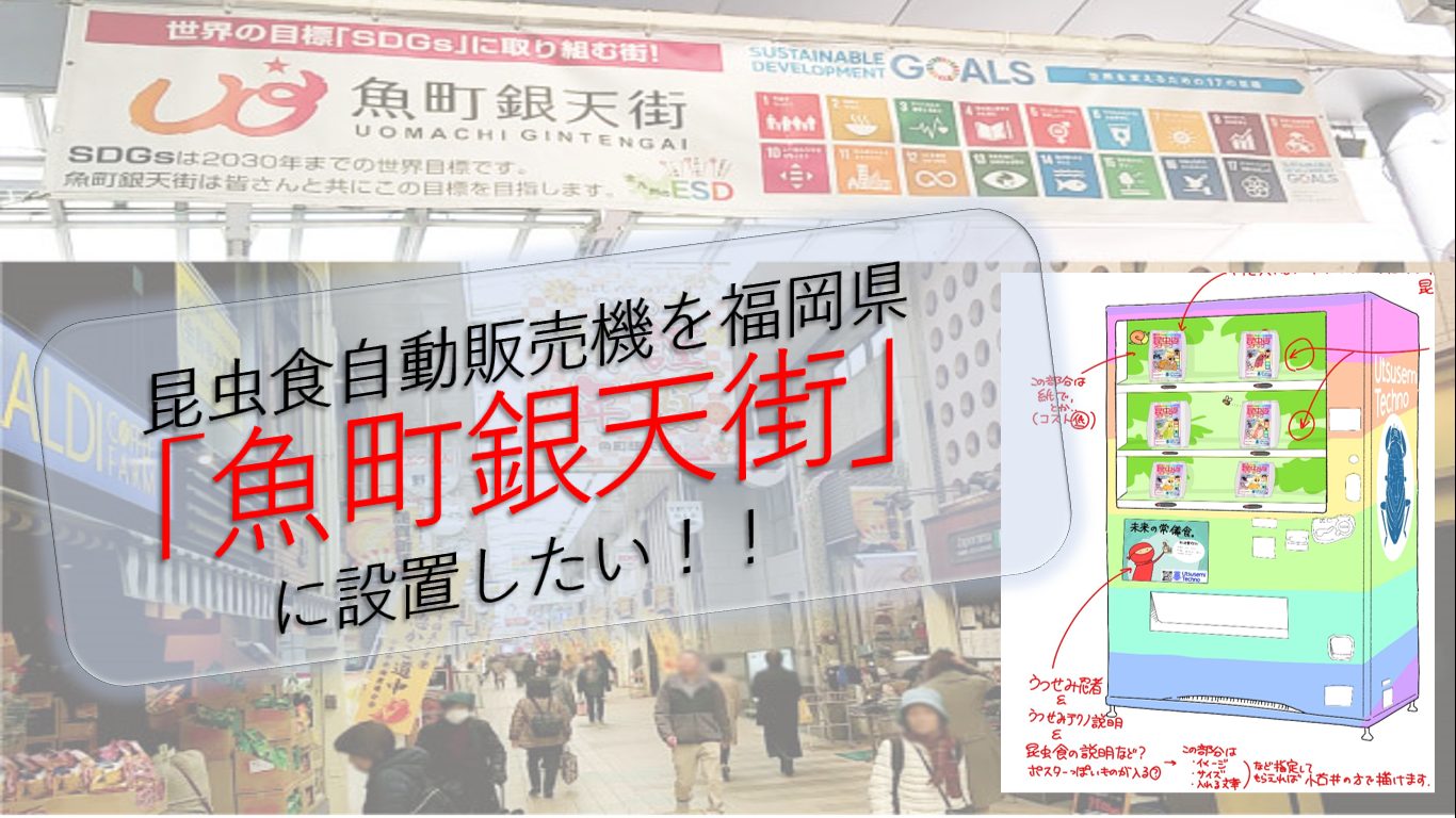 という上記理由より、今回魚町銀天街の皆様にご協力を頂き、昆虫自動販売機を設置したいと考えています!また自動販売機の装飾に関しては様々な人からアイデアを公募をするなどイベント形式で一緒に作っていきたいと考えています!