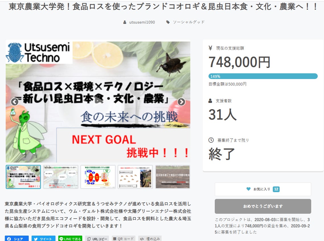 2021/06/21 16:33お世話になっております。うつせみテクノの秋山です。クラウドファンディングまで残り2日となりました!現在まで61人という多くの皆様にご支援をいただき感謝申し上げます。先日、日経新聞主催のフードアグリテックテックのイベント「AG/SUM2021」に参加させていただきました。また、弊社はスタートアップピッチコンテストに参加させていただきファイナリストとして選定していただきました!日頃の皆様の応援のおかげであります。ありがとうございました。さて話が変わりますが、このクラウドファンディング、思い返せば様々な皆様にご協力いただいて成り立っているものです。イナズマロックドリームTVではアーティストの西川貴教さんをはじめ、ボイメンの平松さん、Vtuberの大蔦エルさんやフレンズベースの長島さん。今回のプロジェクトを快く協力してくださり、広報に関しても本当に多くの面でご協力いただいた魚町銀天街の皆様。弊社の活動に興味を持っていただき、取材をしてくださったマスメディアの皆様。東京農業大学の関係者の皆様。そして、ご支援・応援をしてくださっている皆様。本当にうつせみテクノを始めたころには想像できなかったほど多くの皆様に応援していただいております。昆虫食は未来を救うカギになると思いますが、まだまだゲテモノのイメージはあります。今後も今回のプロジェクトだけでなく、昆虫食の未来を信じている私から 多くの場面で情報発信やイベント・商品販売・研究をしていきます!!!その活動で皆様に少しでも恩返しが出来れば幸いです。そしてまだ残り2日です!そして残り2日で"ゴール"ではなく"スタート"です!!!今後とも弊社はユニークで面白い創造を大事に社会問題解決に邁進してまいります。一緒に未来の食を作っていきましょう!よろしくお願いいたします。うつせみテクノ 秋山大知 もっと見る