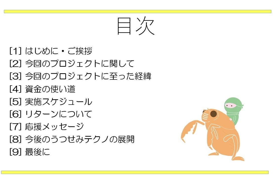 本活動に関するご支援者様のお名前(ニックネームでも構いません)をうつせみテクノWebサイトに掲載&お礼のメールをさせて頂きます。