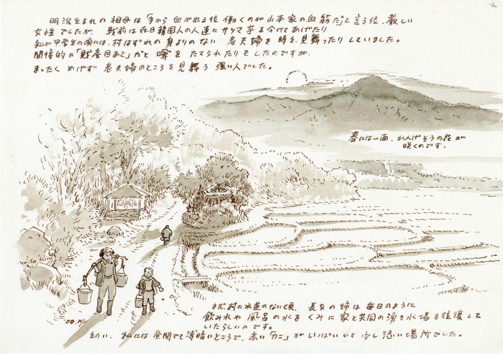 (トートバッグのデザインとなる「野崎島の野首集落」の絵)