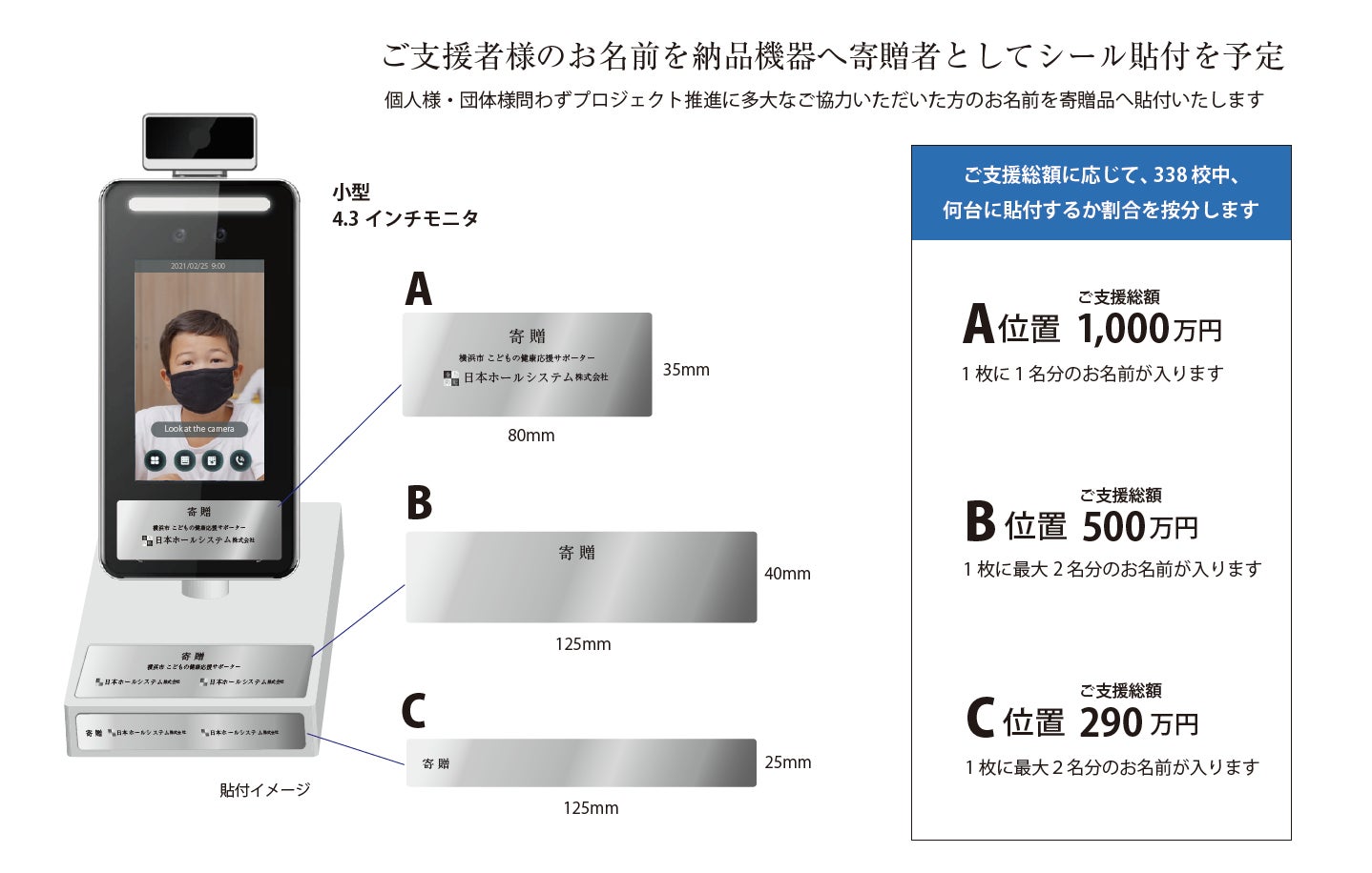 ・大きなご支援をいただけた方には検温器に寄贈者様としてお名前シールを貼付いたします。