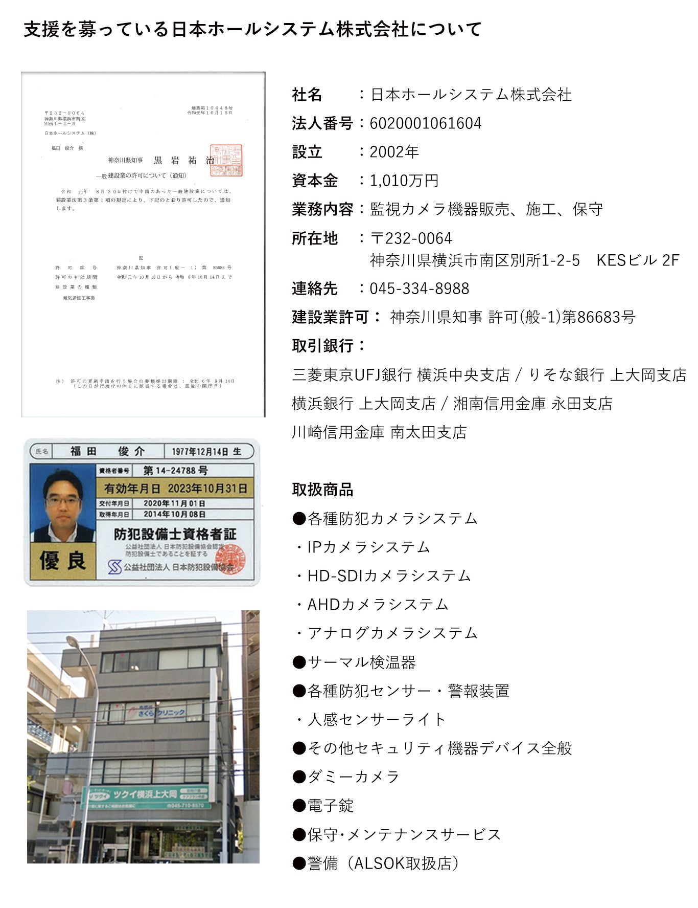 個人宅から店舗、コンビニ店、工場・物流倉庫の防犯カメラ設置・販売を行っております。地元警察署様への情報提供や、大使館、公共施設へのカメラ設置事例ございます。