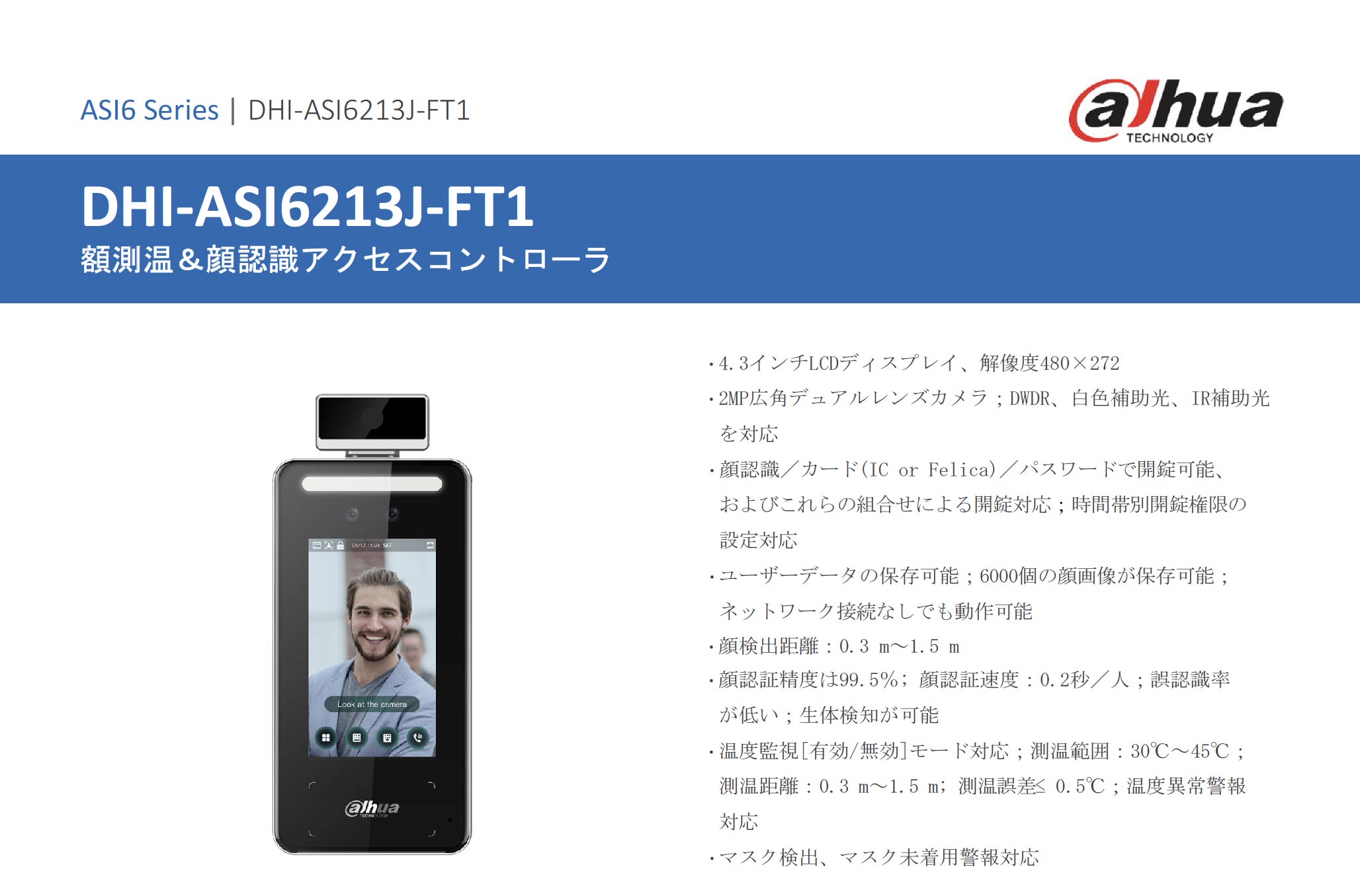 Dahua社製 4.3インチ小型検温器 仕様書の一部