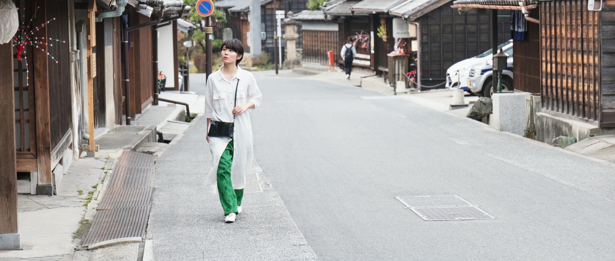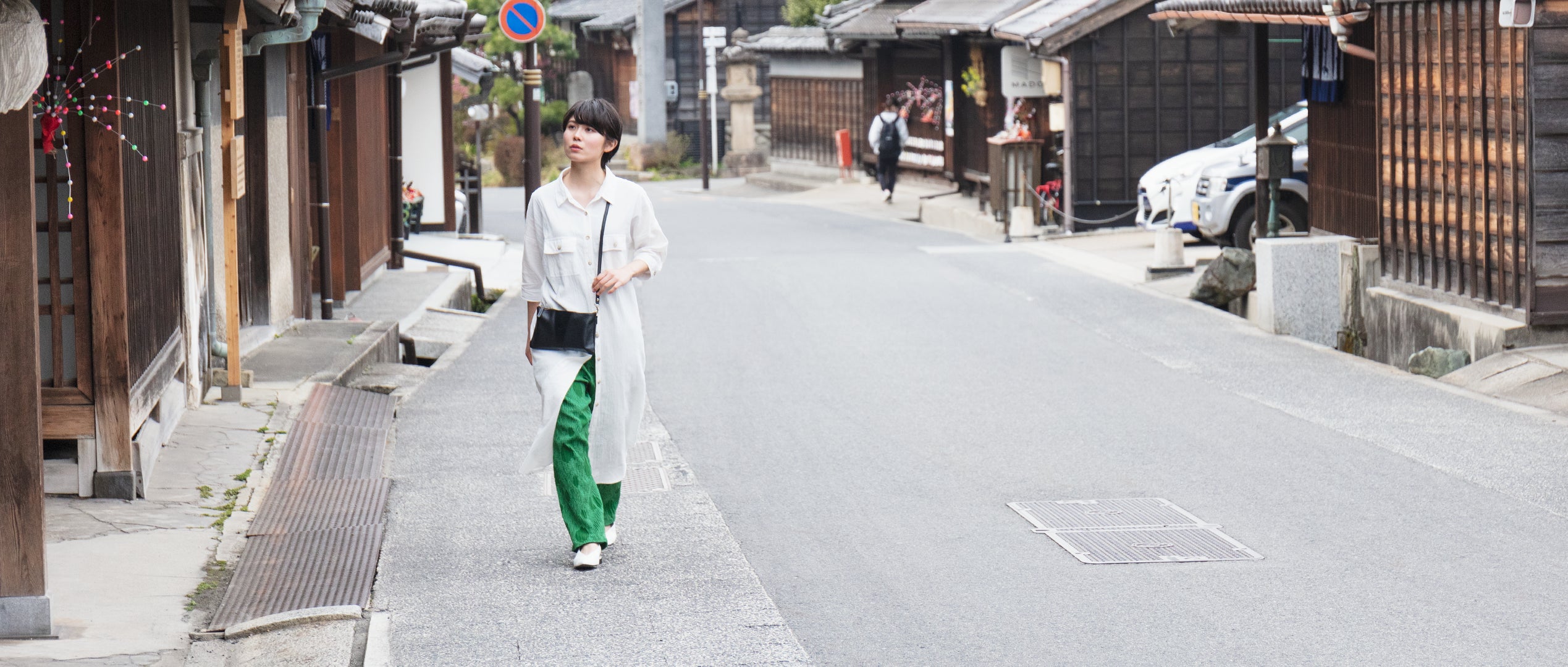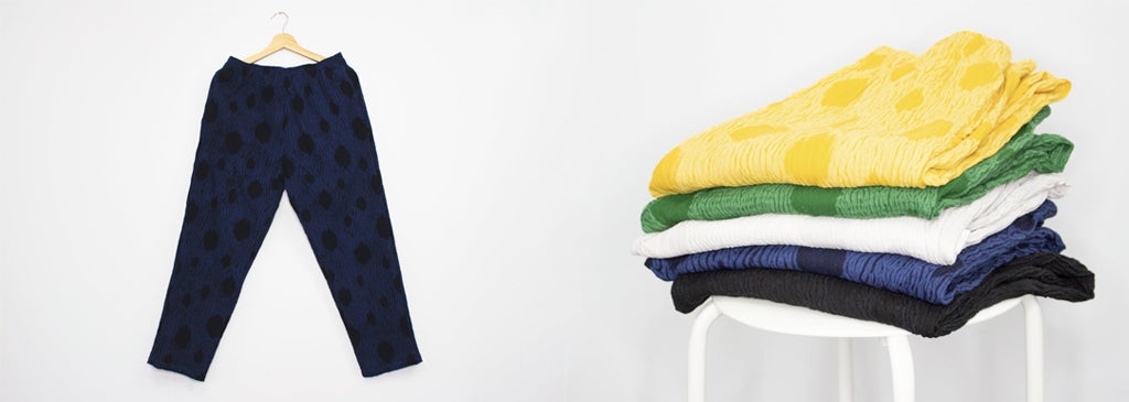 地域で眠っている材料、コットン100%の素材、ストレッチ性があり、きちんと厚みがあり、男女問わず使える柄と向き合う中で思いついたのは、男女問わず着用できるパンツでした。