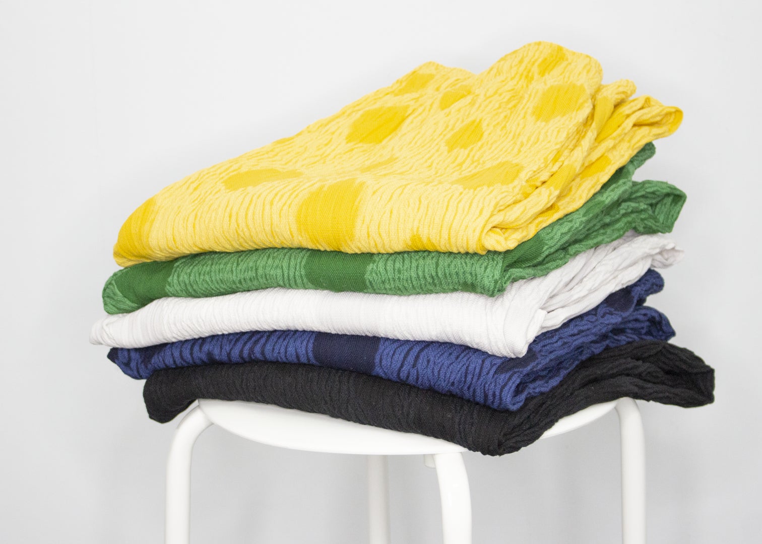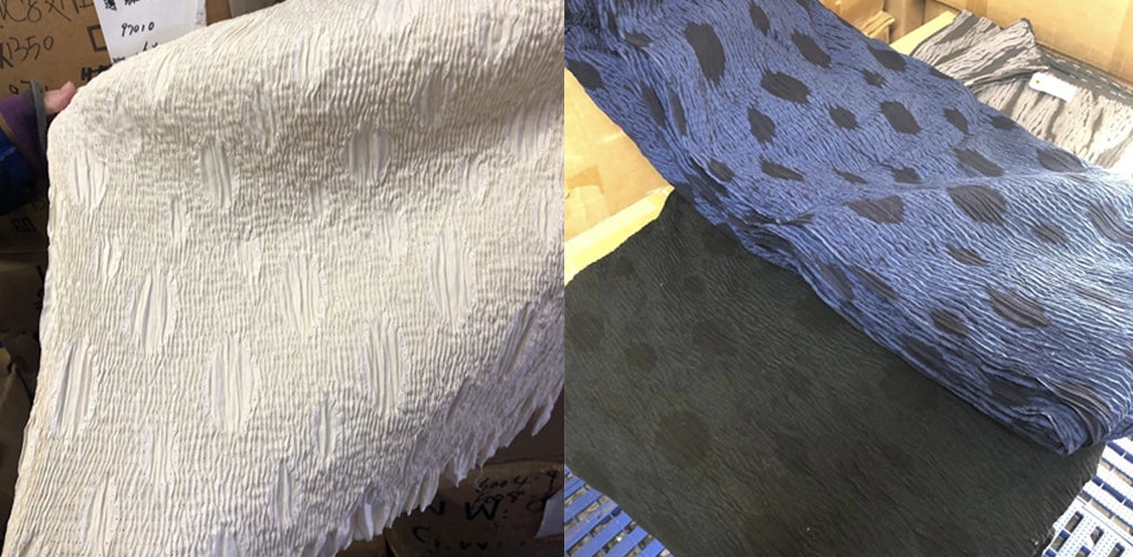 野々山絞りで出会った生地は、縫い絞り(ぬいしぼり)という縫った糸を引き締める技法に、塩縮という生地を引き締める加工がかけられているものでした。この加工によって生地はプリーツのようなシワ形状を保持してやわらかく伸び縮みし、単色で染めても色の濃淡が面白い表情となります。この縫い絞りの生地の特徴は、有松・鳴海絞りの技法がしっかりと施されているにも関わらず、男女問わず日常使いしやすいポップなドット柄です。