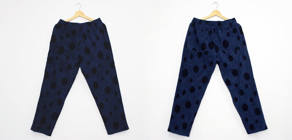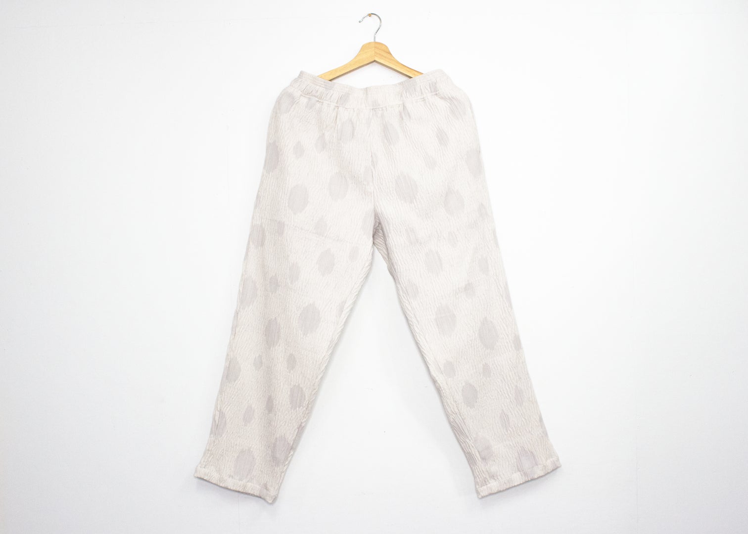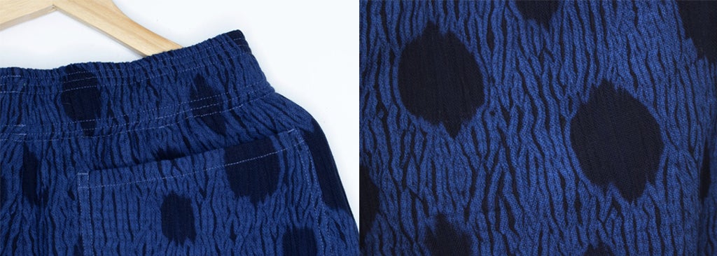 ゆあんのパンツ - ドット柄では、縫い絞りという技法によって生まれたドット柄と生地の折りを活かし、塩縮(綿生地を化学的に縮ませる加工)と染色を加えることで、カジュアルな印象とやわかなストレッチ性を実現しています。